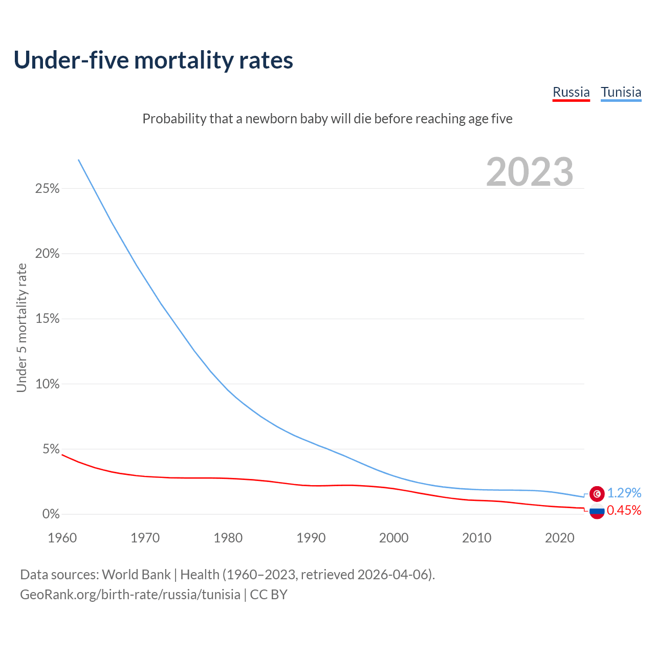 The chance that a newborn baby will die before reaching age five is 0.45% in Russia and 1.29% in Tunisia. Above is a chart with historical data on under-five mortality rates.