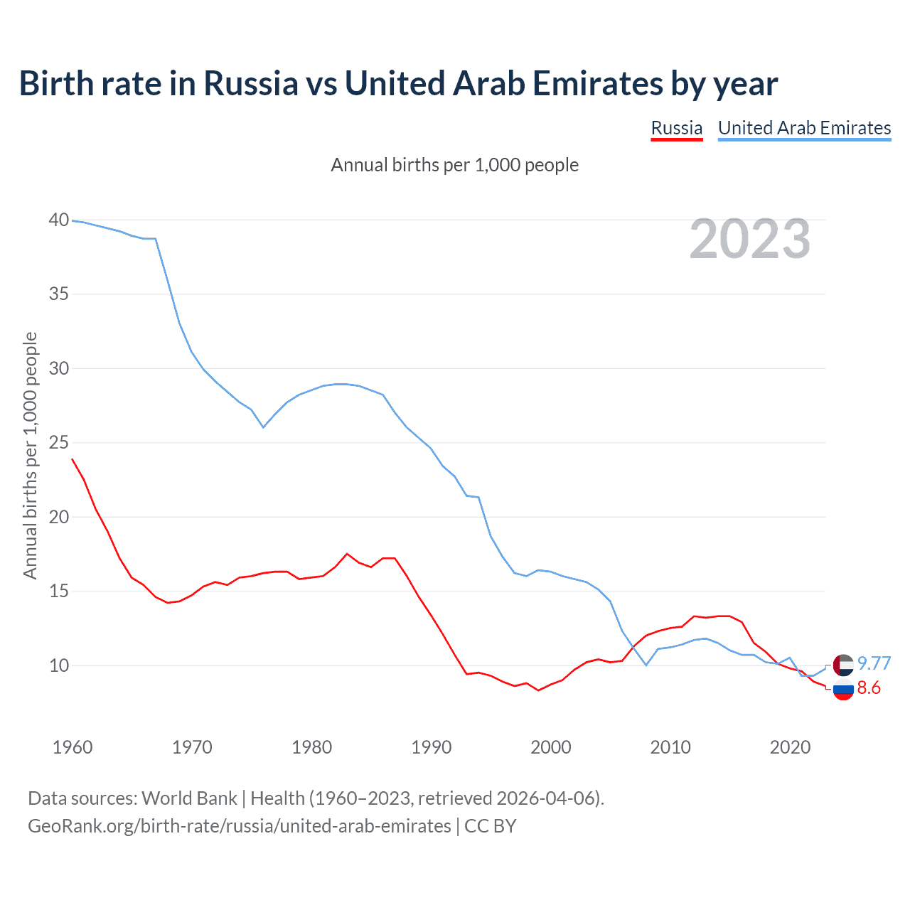 Russia has an annual birth rate of 8.6 births per 1,000 people, compared to 9.77 for the United Arab Emirates. The average number of children a woman is expected to have during her lifetime — the fertility rate, is 1.41 in Russia and 1.2 in the United Arab Emirates — 14.9% difference.