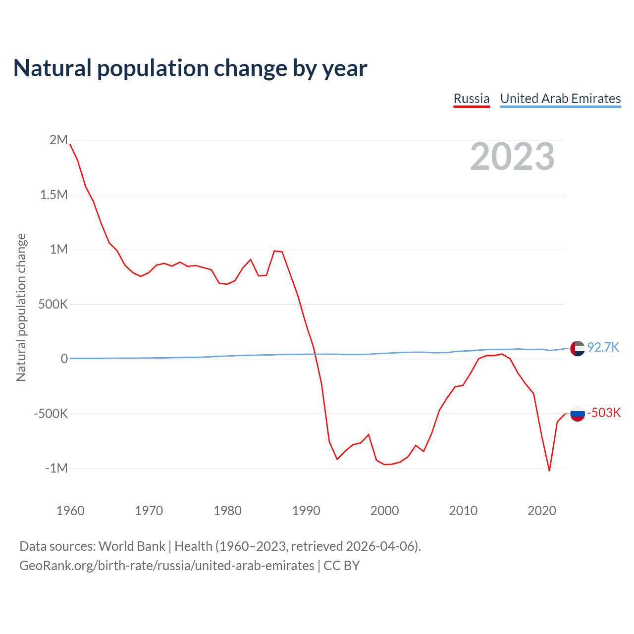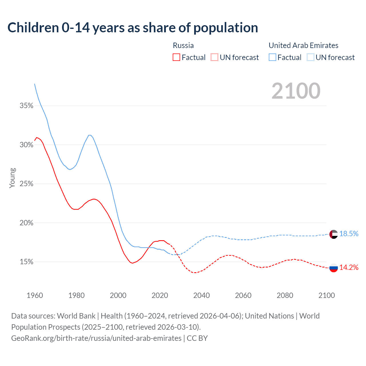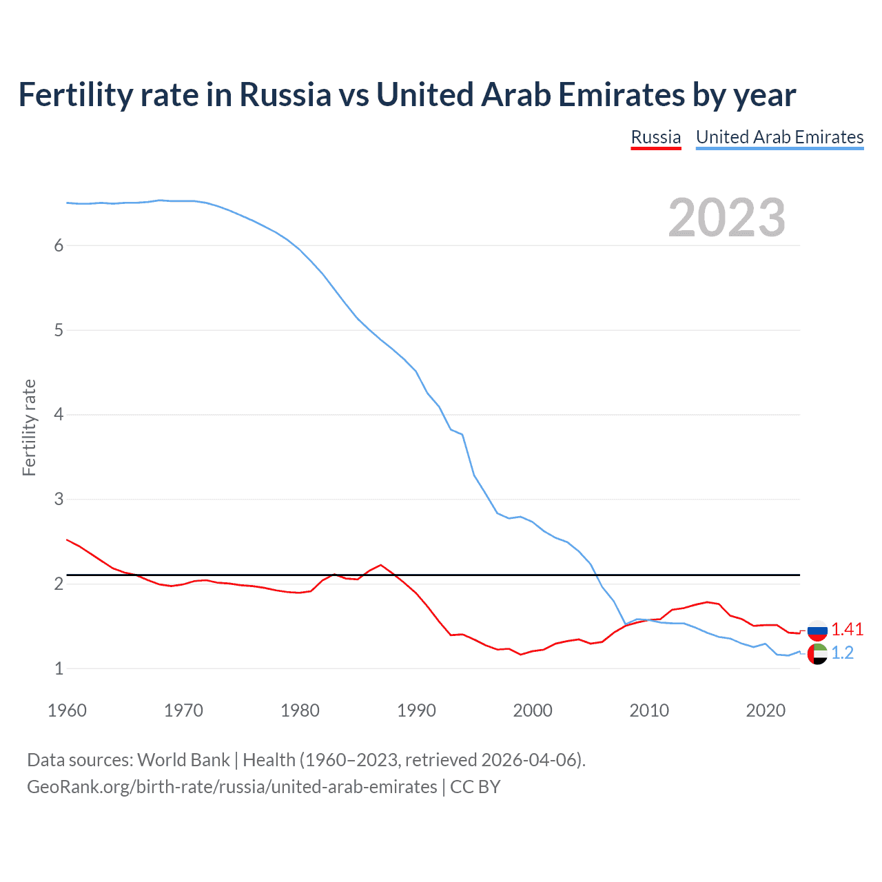 According to the latest available data on birth rates, the fertility rate in Russia was 1.41 children per woman in 2023, compared to 1.2 in the United Arab Emirates in 2023. The replacement level is considered to be 2.1 children per woman.