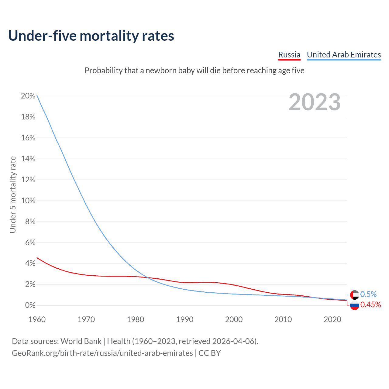 The chance that a newborn baby will die before reaching age five is 0.45% in Russia and 0.5% in the United Arab Emirates. Above is a chart with historical data on under-five mortality rates.