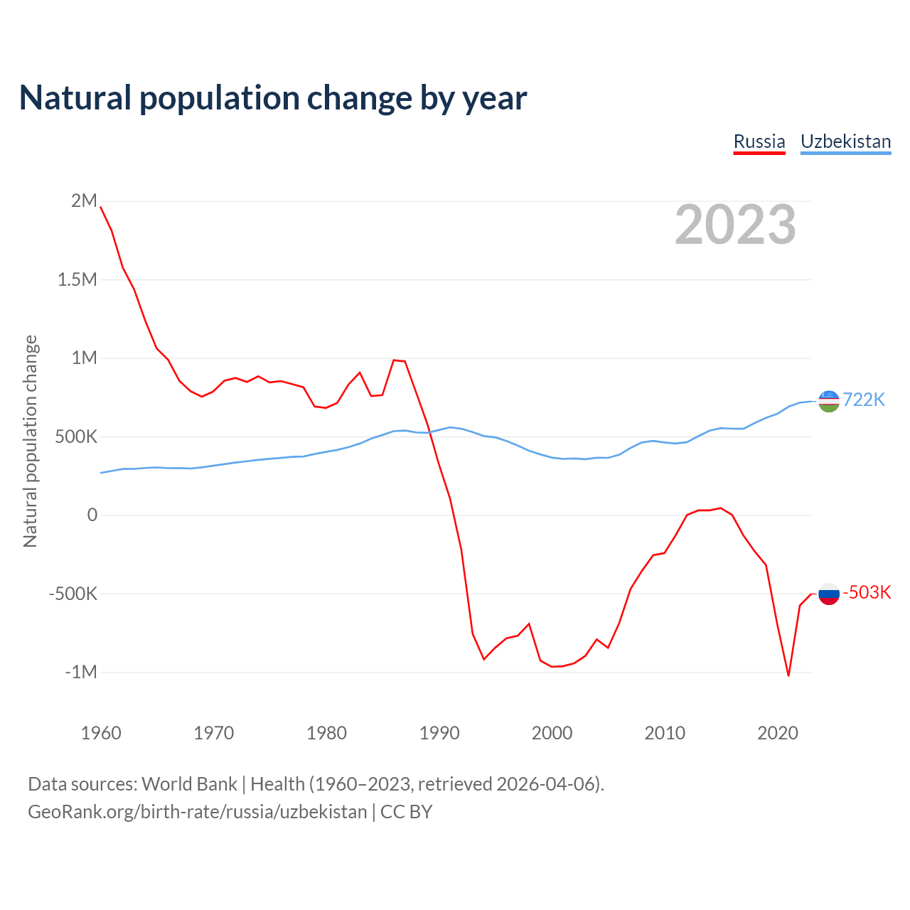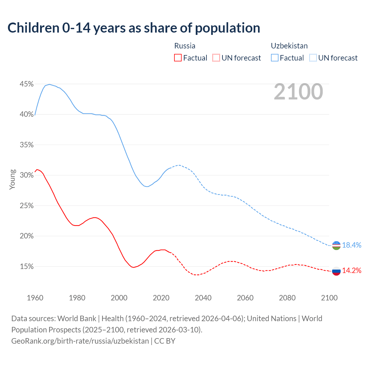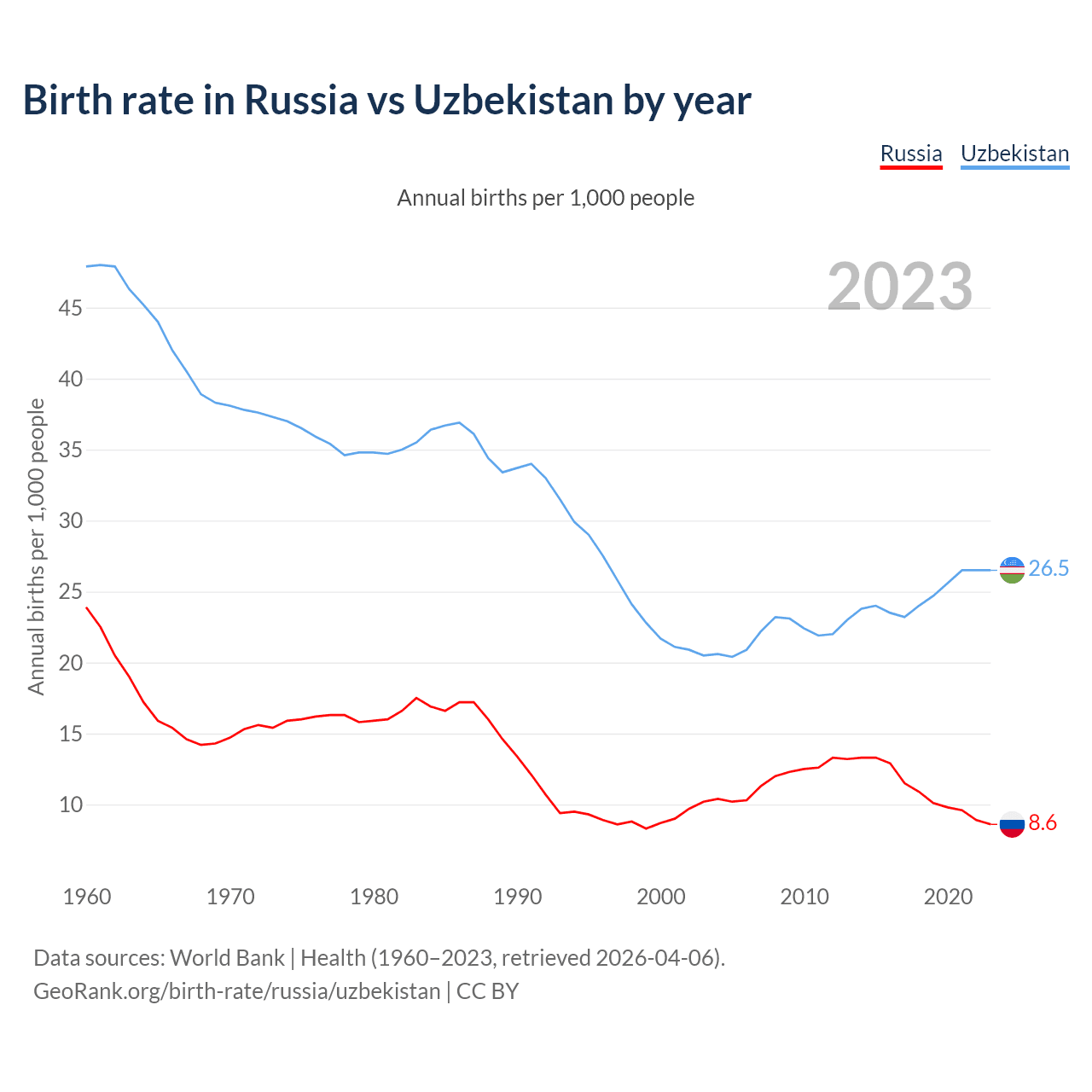 Russia has an annual birth rate of 8.6 births per 1,000 people, compared to 26.5 for Uzbekistan. The average number of children a woman is expected to have during her lifetime — the fertility rate, is 1.41 in Russia and 3.5 in Uzbekistan — 148.2% difference.