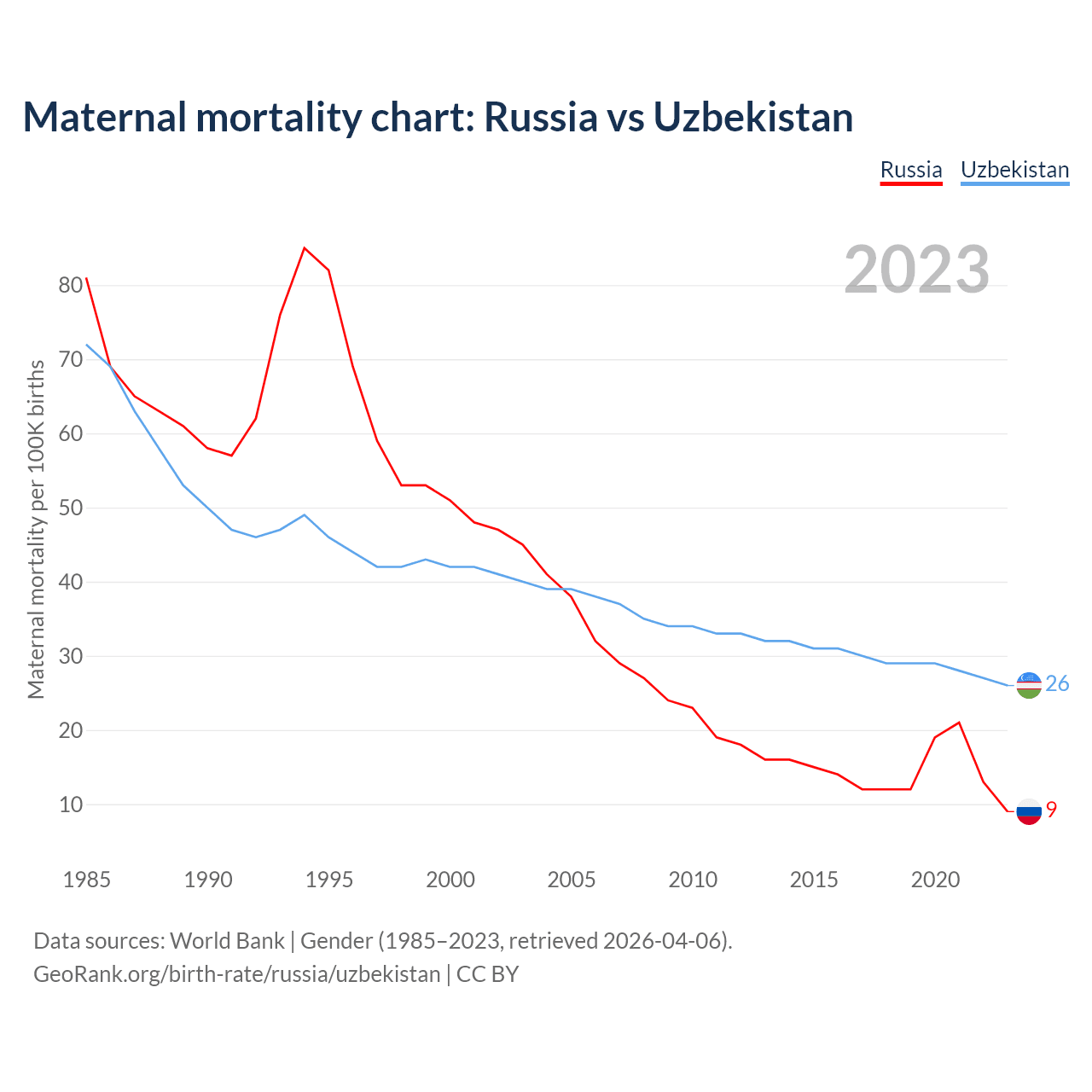 The maternal mortality rate, which is the probability of dying during childbirth or within 42 days of pregnancy termination, is 9 deaths per 100,000 live births in Russia, compared to 26 deaths in Uzbekistan.