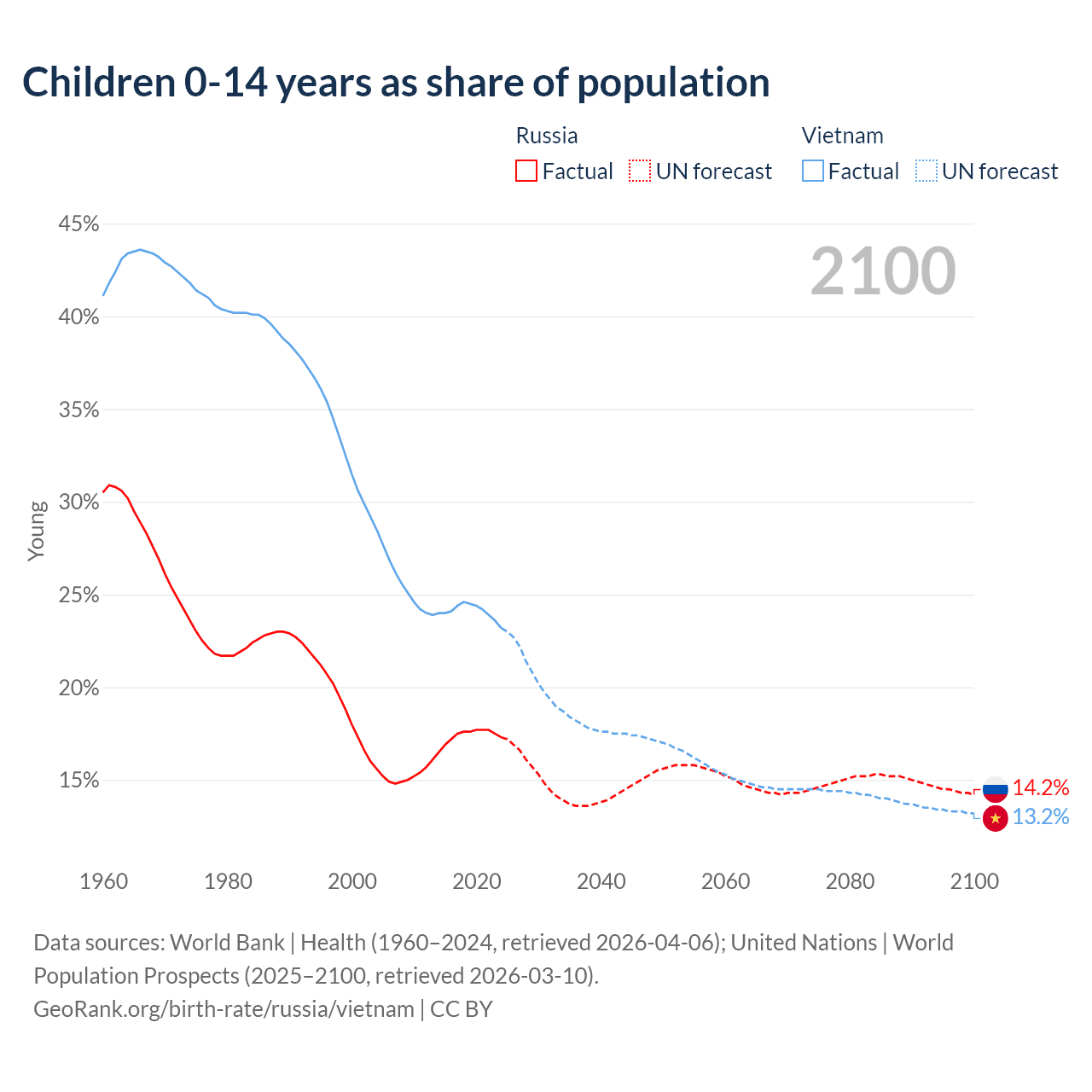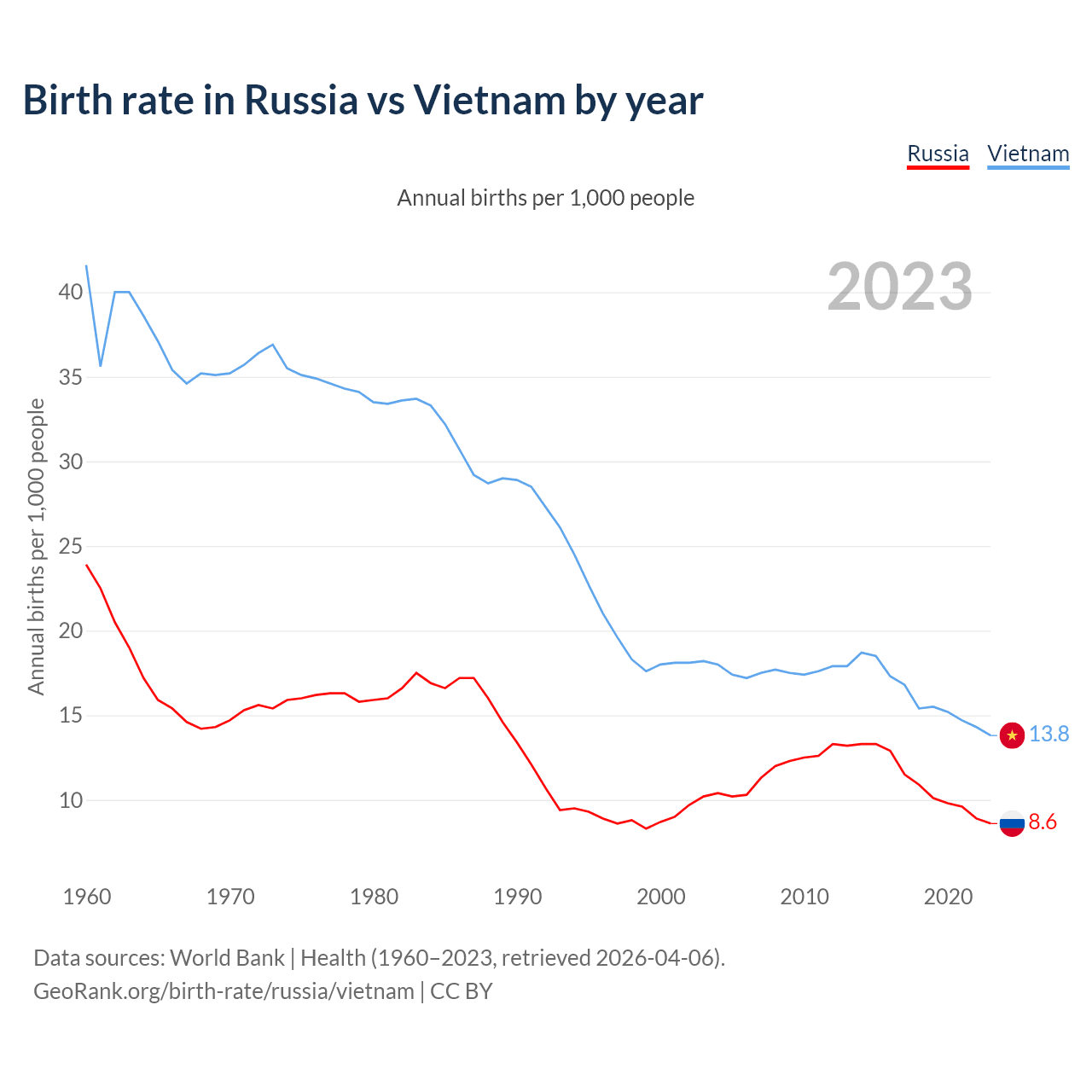 Russia has an annual birth rate of 8.6 births per 1,000 people, compared to 13.8 for Vietnam. The average number of children a woman is expected to have during her lifetime — the fertility rate, is 1.41 in Russia and 1.91 in Vietnam — 35.7% difference.