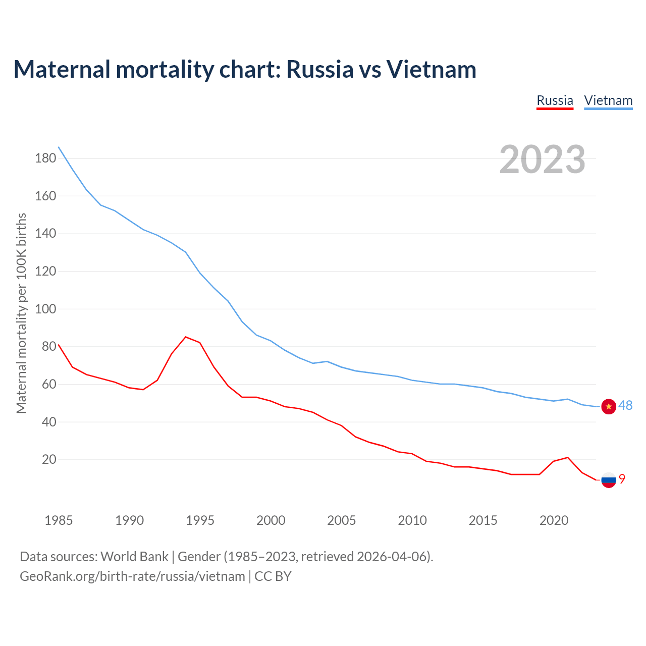 The maternal mortality rate, which is the probability of dying during childbirth or within 42 days of pregnancy termination, is 9 deaths per 100,000 live births in Russia, compared to 48 deaths in Vietnam.