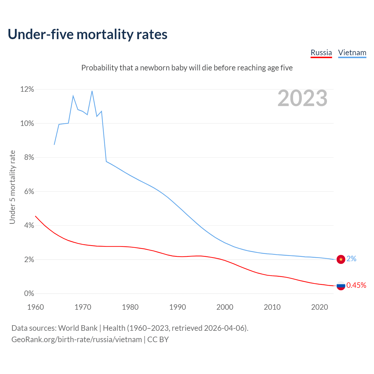 The chance that a newborn baby will die before reaching age five is 0.45% in Russia and 2% in Vietnam. Above is a chart with historical data on under-five mortality rates.