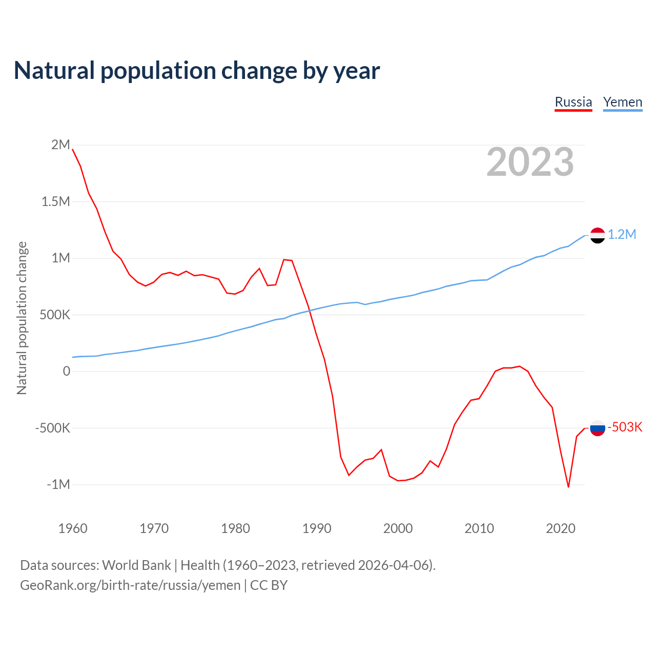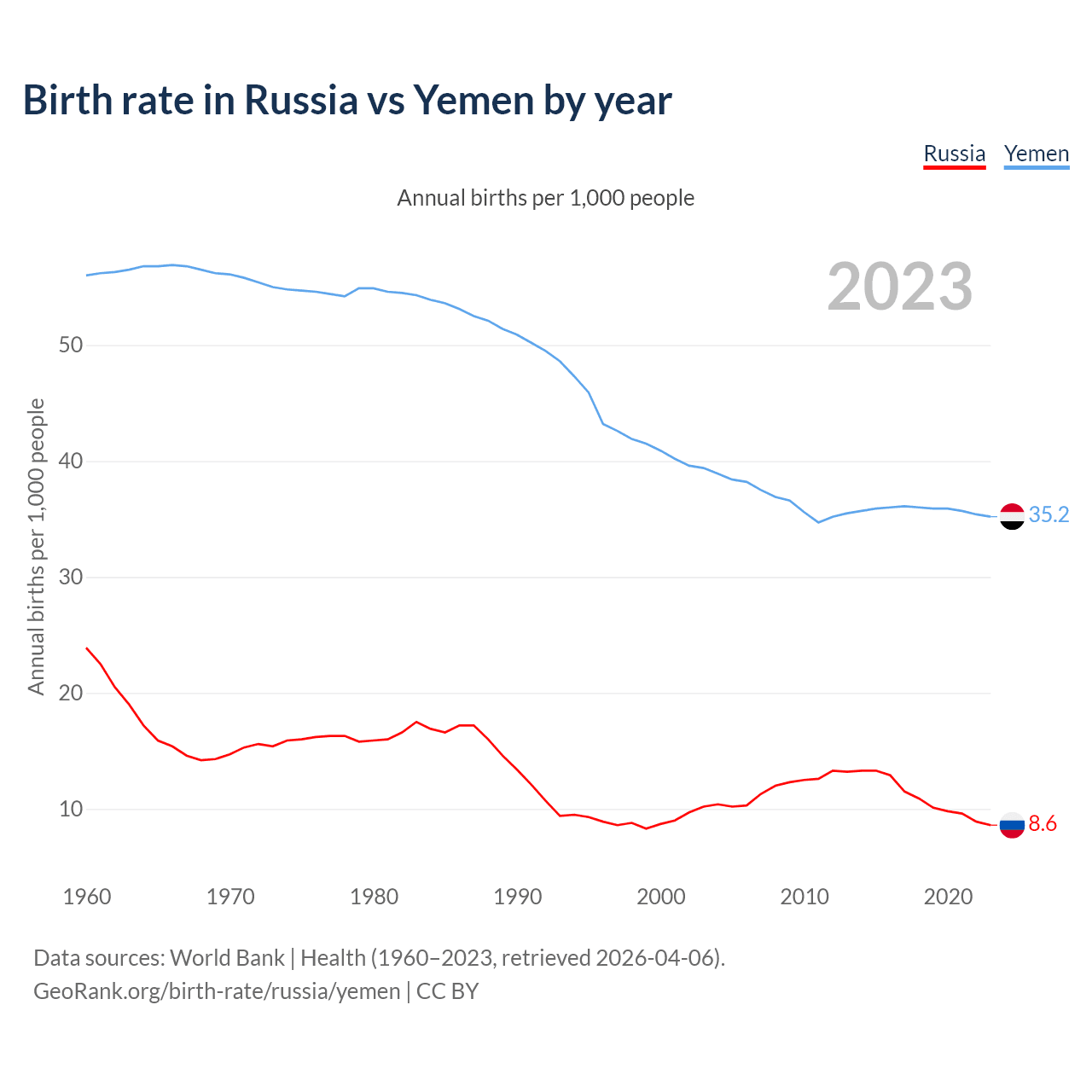 Russia has an annual birth rate of 8.6 births per 1,000 people, compared to 35.2 for Yemen. The average number of children a woman is expected to have during her lifetime — the fertility rate, is 1.41 in Russia and 4.59 in Yemen — 225.5% difference.