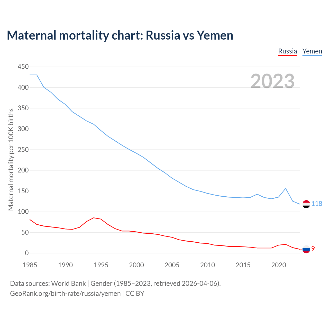 The maternal mortality rate, which is the probability of dying during childbirth or within 42 days of pregnancy termination, is 9 deaths per 100,000 live births in Russia, compared to 118 deaths in Yemen.
