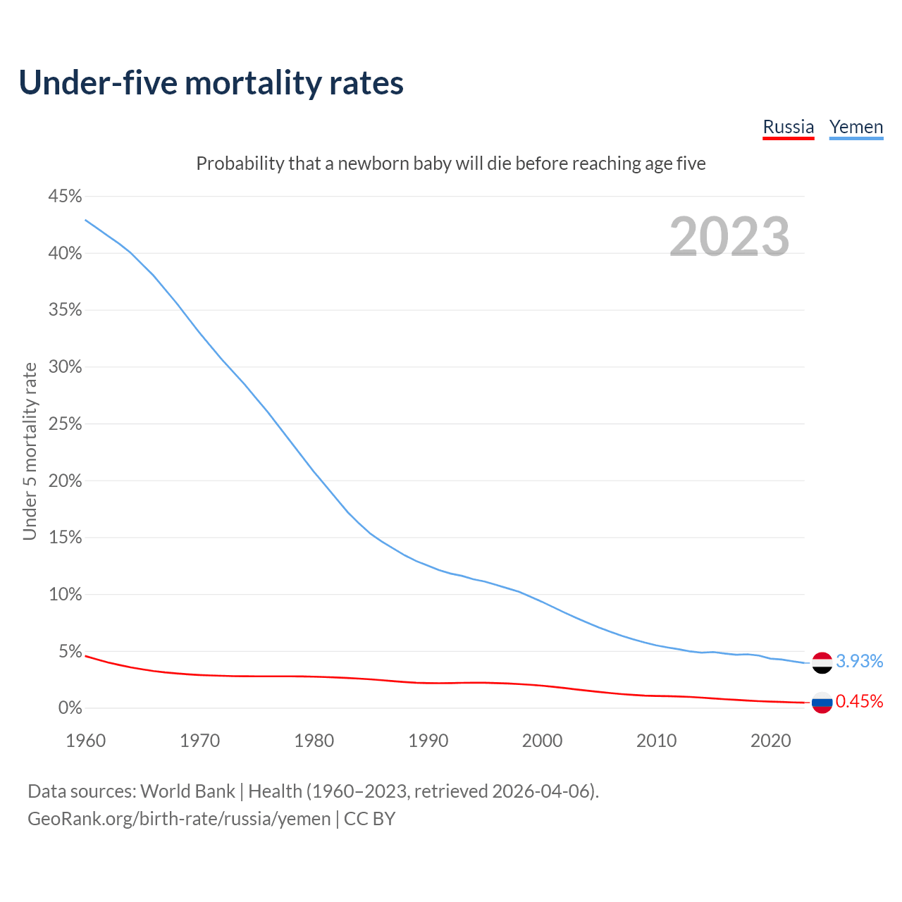 The chance that a newborn baby will die before reaching age five is 0.45% in Russia and 3.93% in Yemen. Above is a chart with historical data on under-five mortality rates.
