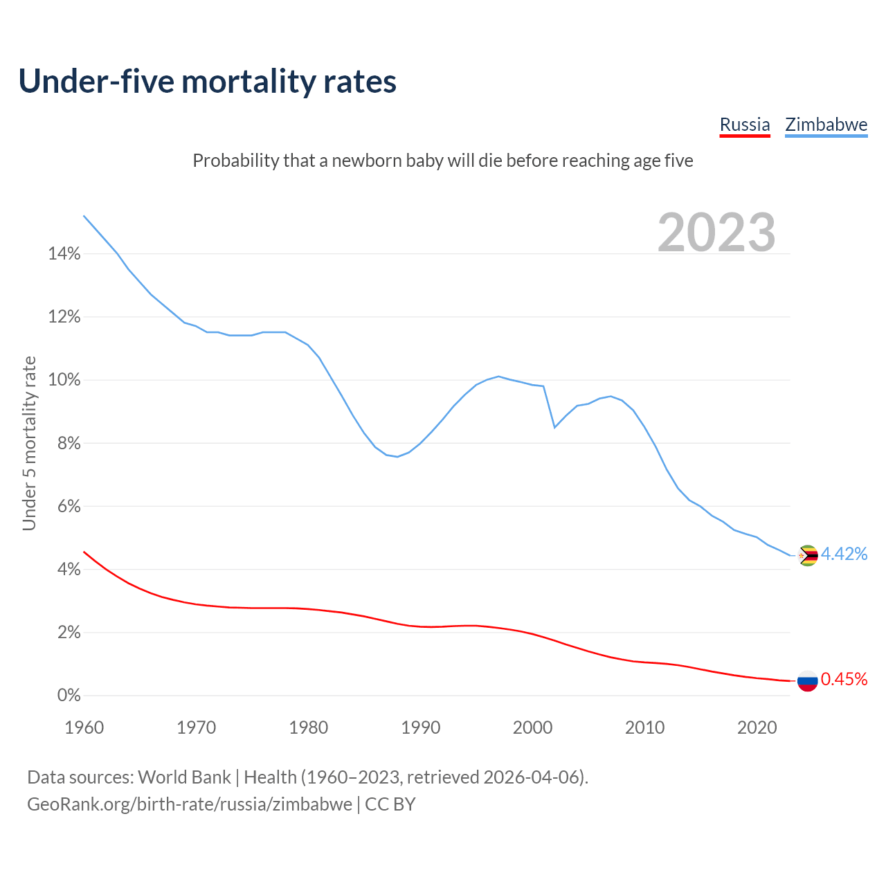 The chance that a newborn baby will die before reaching age five is 0.45% in Russia and 4.42% in Zimbabwe. Above is a chart with historical data on under-five mortality rates.