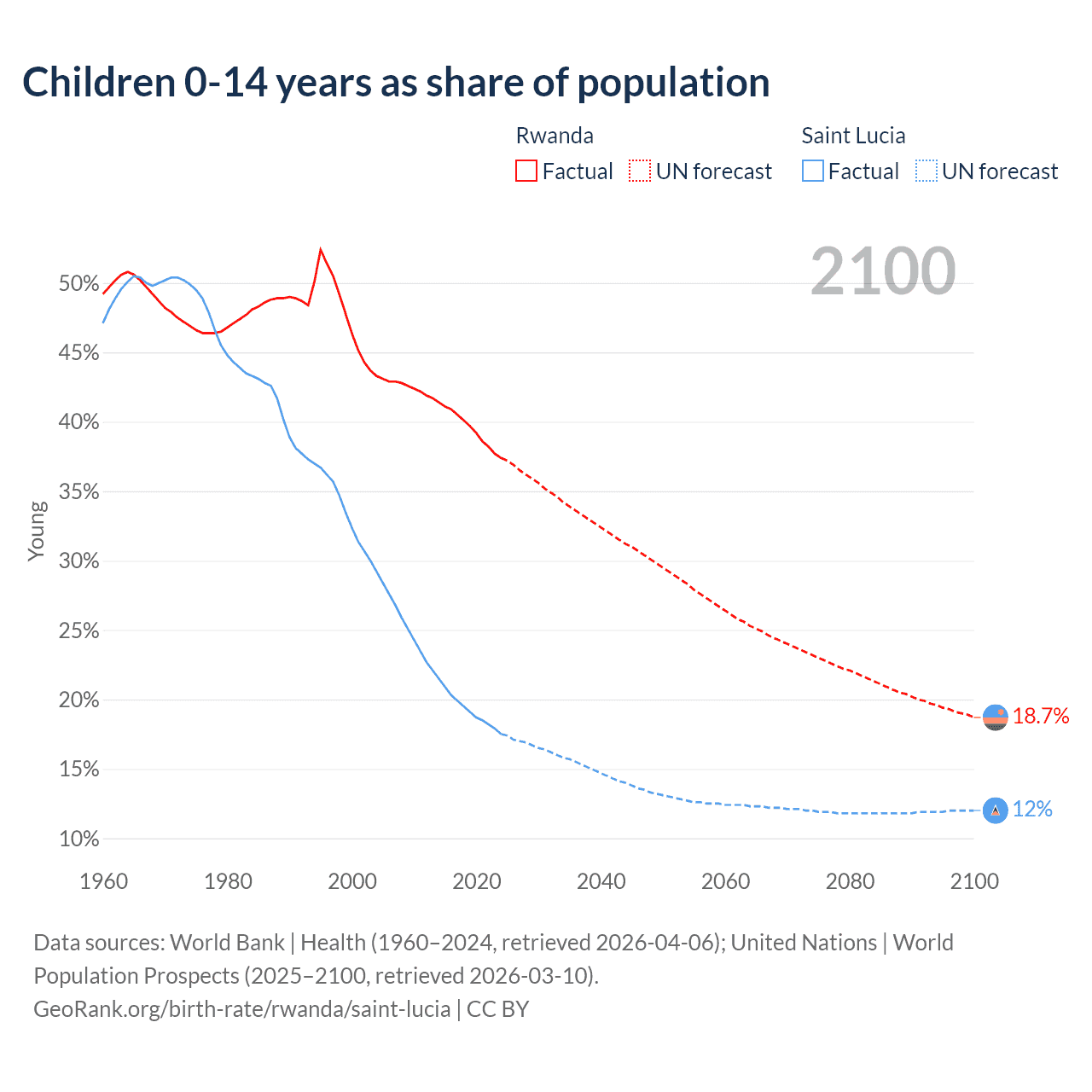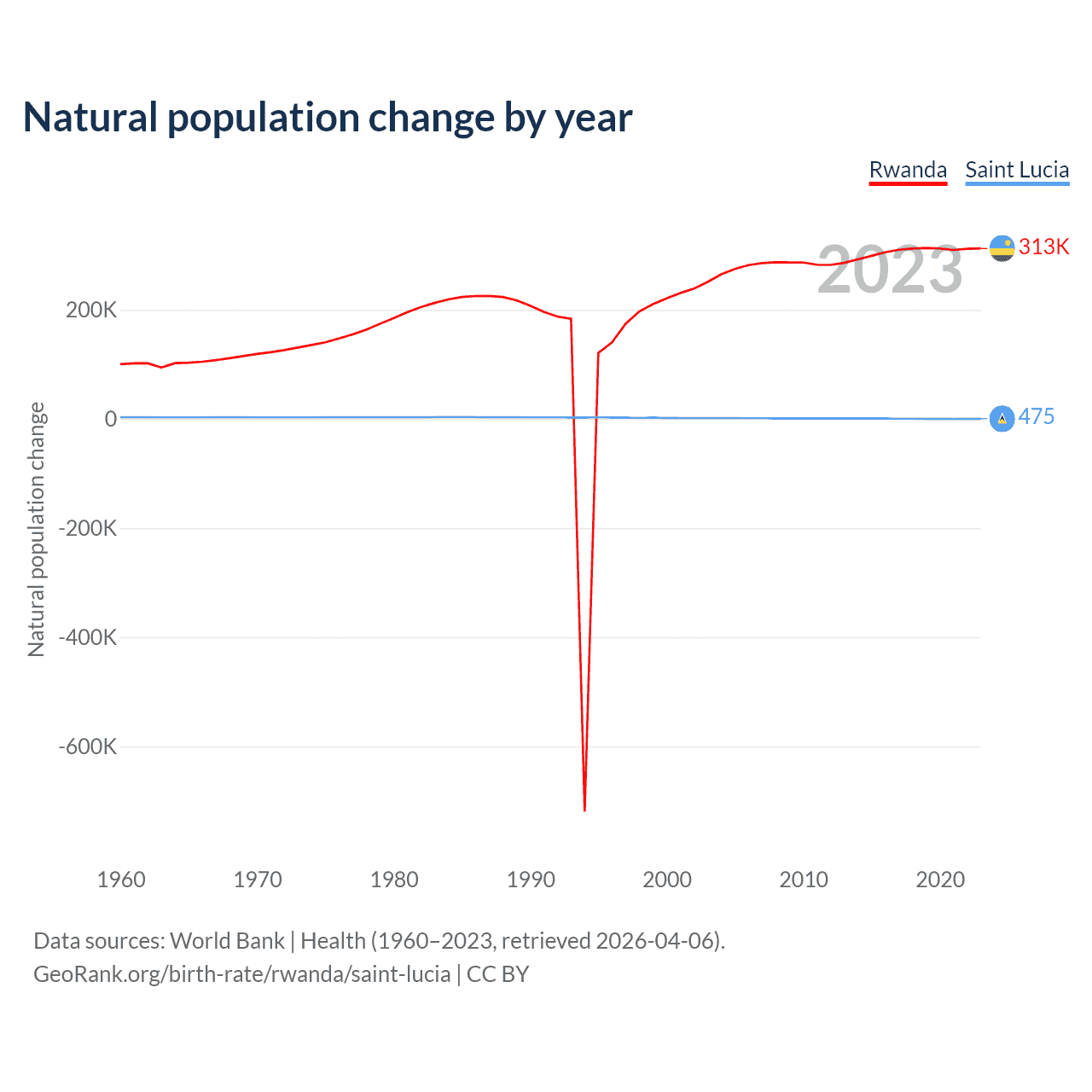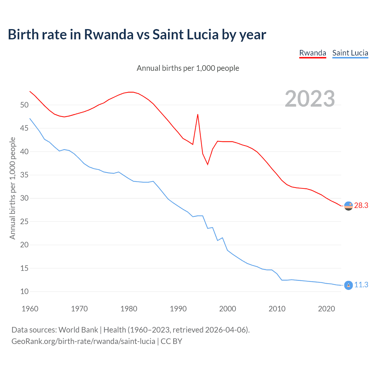 Rwanda has an annual birth rate of 28.3 births per 1,000 people, compared to 11.3 for Saint Lucia. The average number of children a woman is expected to have during her lifetime — the fertility rate, is 3.7 in Rwanda and 1.38 in Saint Lucia — 62.7% difference.