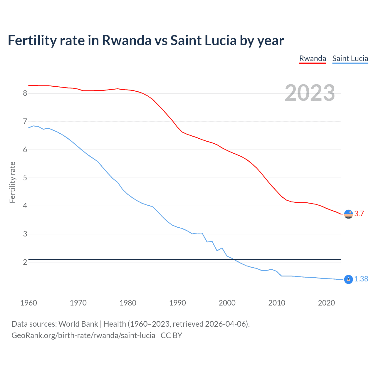 According to the latest available data on birth rates, the fertility rate in Rwanda was 3.7 children per woman in 2023, compared to 1.38 in Saint Lucia in 2023. The replacement level is considered to be 2.1 children per woman.