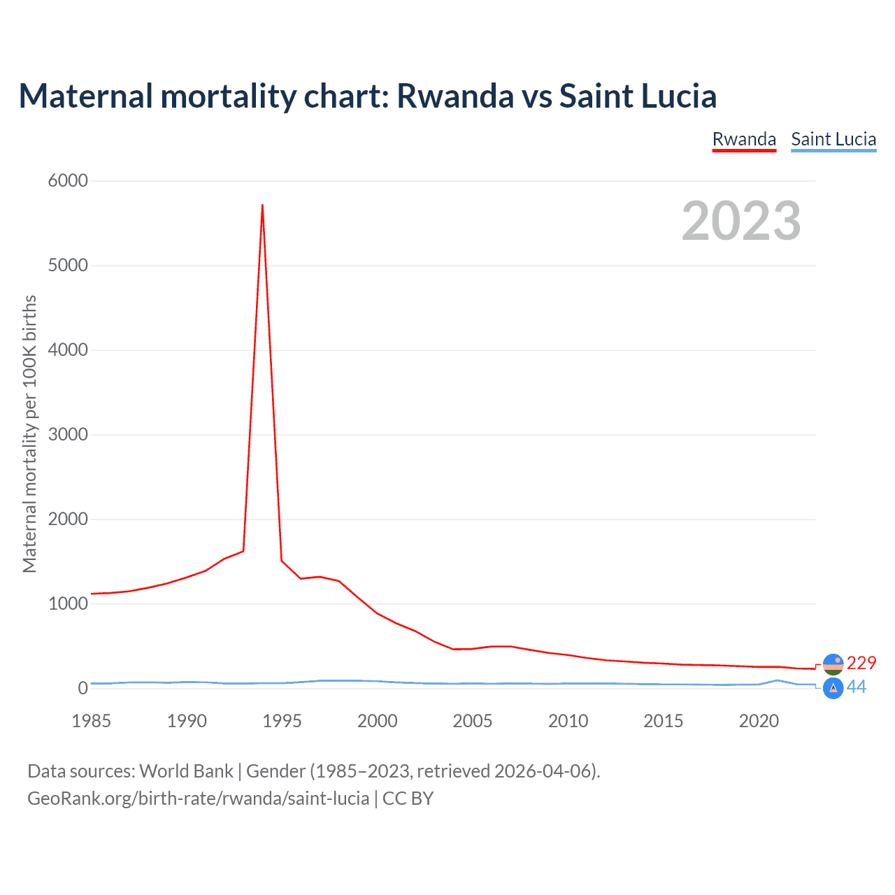 The maternal mortality rate, which is the probability of dying during childbirth or within 42 days of pregnancy termination, is 229 deaths per 100,000 live births in Rwanda, compared to 44 deaths in Saint Lucia.