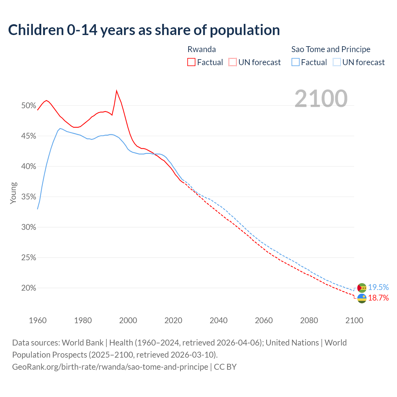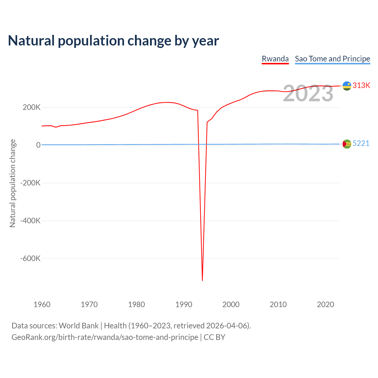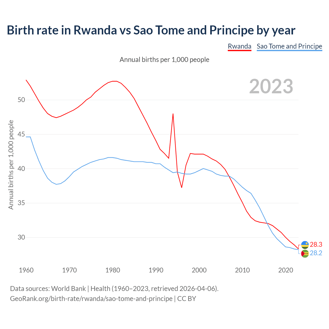 Rwanda has an annual birth rate of 28.3 births per 1,000 people, compared to 28.2 for Sao Tome and Principe. The average number of children a woman is expected to have during her lifetime — the fertility rate, is 3.7 in Rwanda and 3.64 in Sao Tome and Principe — 1.46% difference.