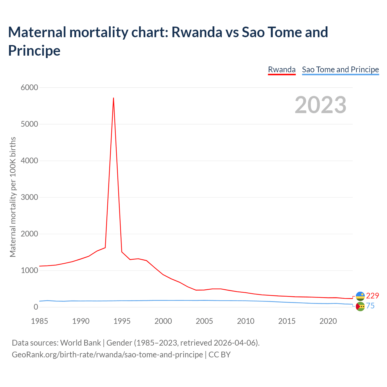 The maternal mortality rate, which is the probability of dying during childbirth or within 42 days of pregnancy termination, is 229 deaths per 100,000 live births in Rwanda, compared to 75 deaths in Sao Tome and Principe.