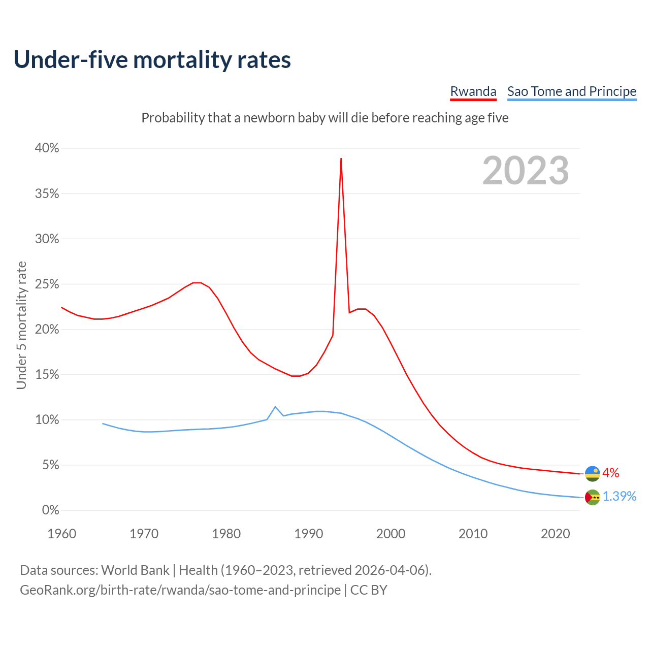 The chance that a newborn baby will die before reaching age five is 4% in Rwanda and 1.39% in Sao Tome and Principe. Above is a chart with historical data on under-five mortality rates.