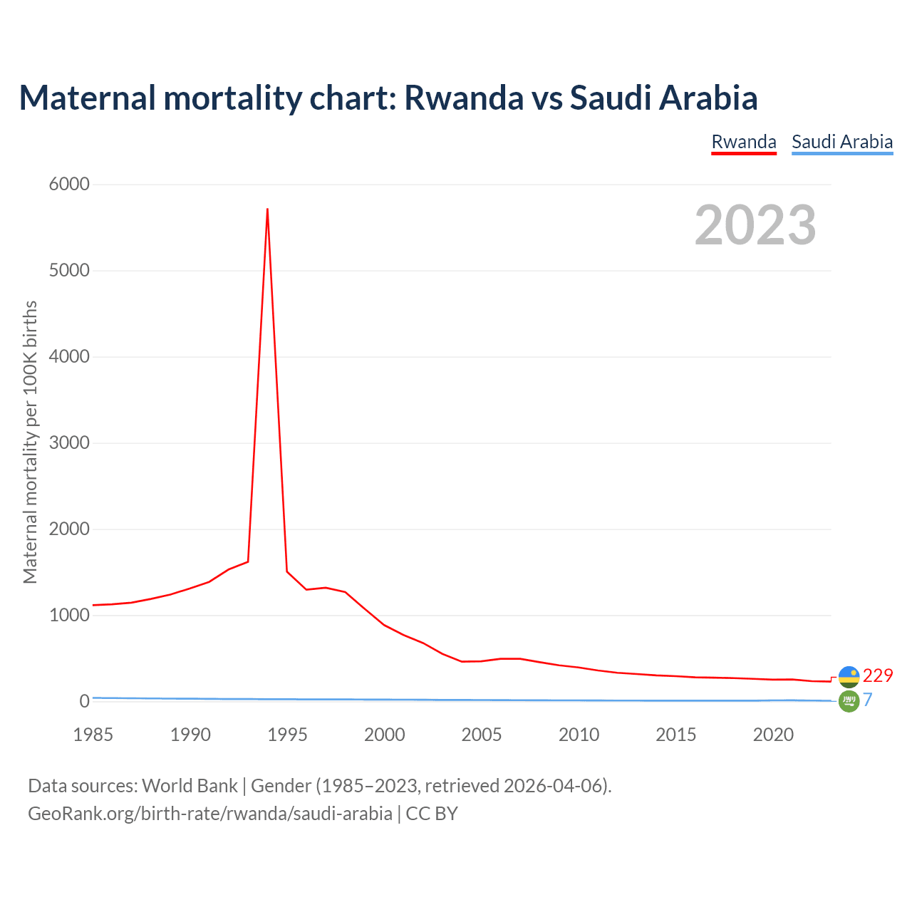 The maternal mortality rate, which is the probability of dying during childbirth or within 42 days of pregnancy termination, is 229 deaths per 100,000 live births in Rwanda, compared to 7 deaths in Saudi Arabia.