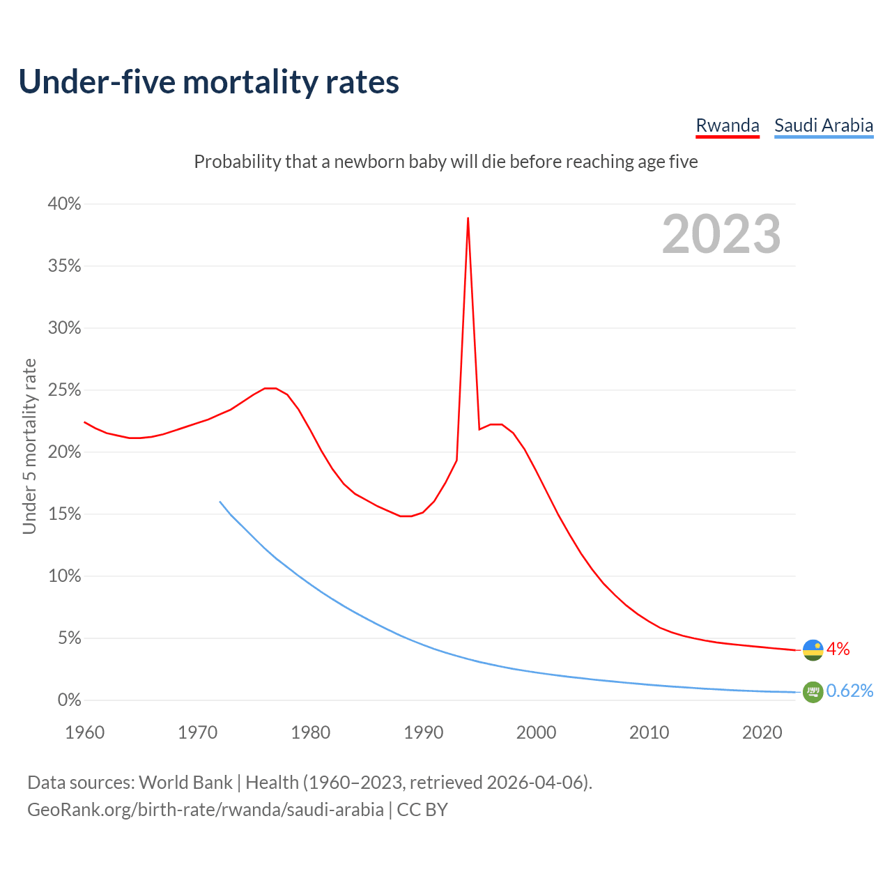 The chance that a newborn baby will die before reaching age five is 4% in Rwanda and 0.62% in Saudi Arabia. Above is a chart with historical data on under-five mortality rates.