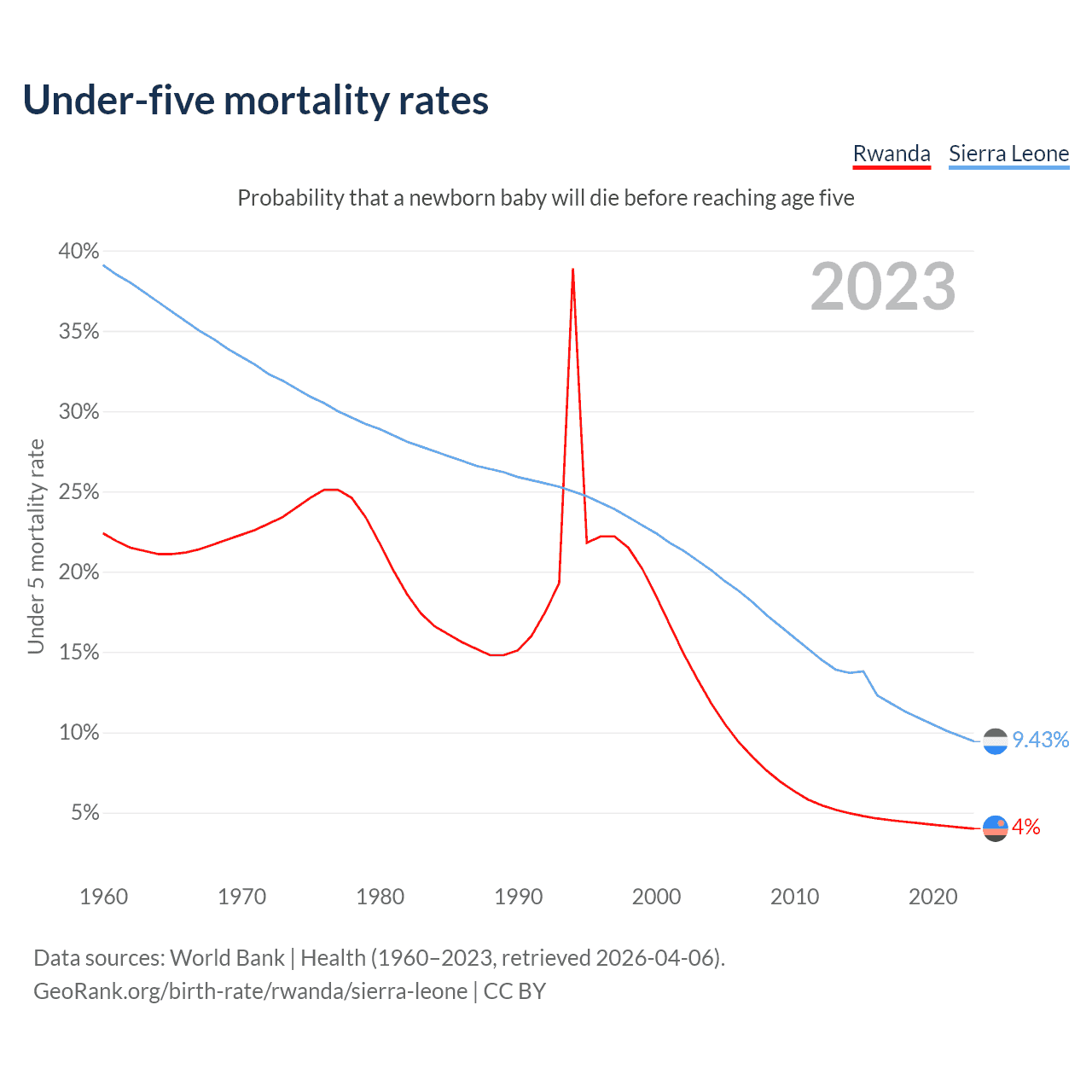 The chance that a newborn baby will die before reaching age five is 4% in Rwanda and 9.43% in Sierra Leone. Above is a chart with historical data on under-five mortality rates.