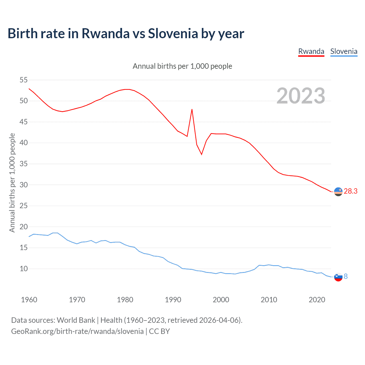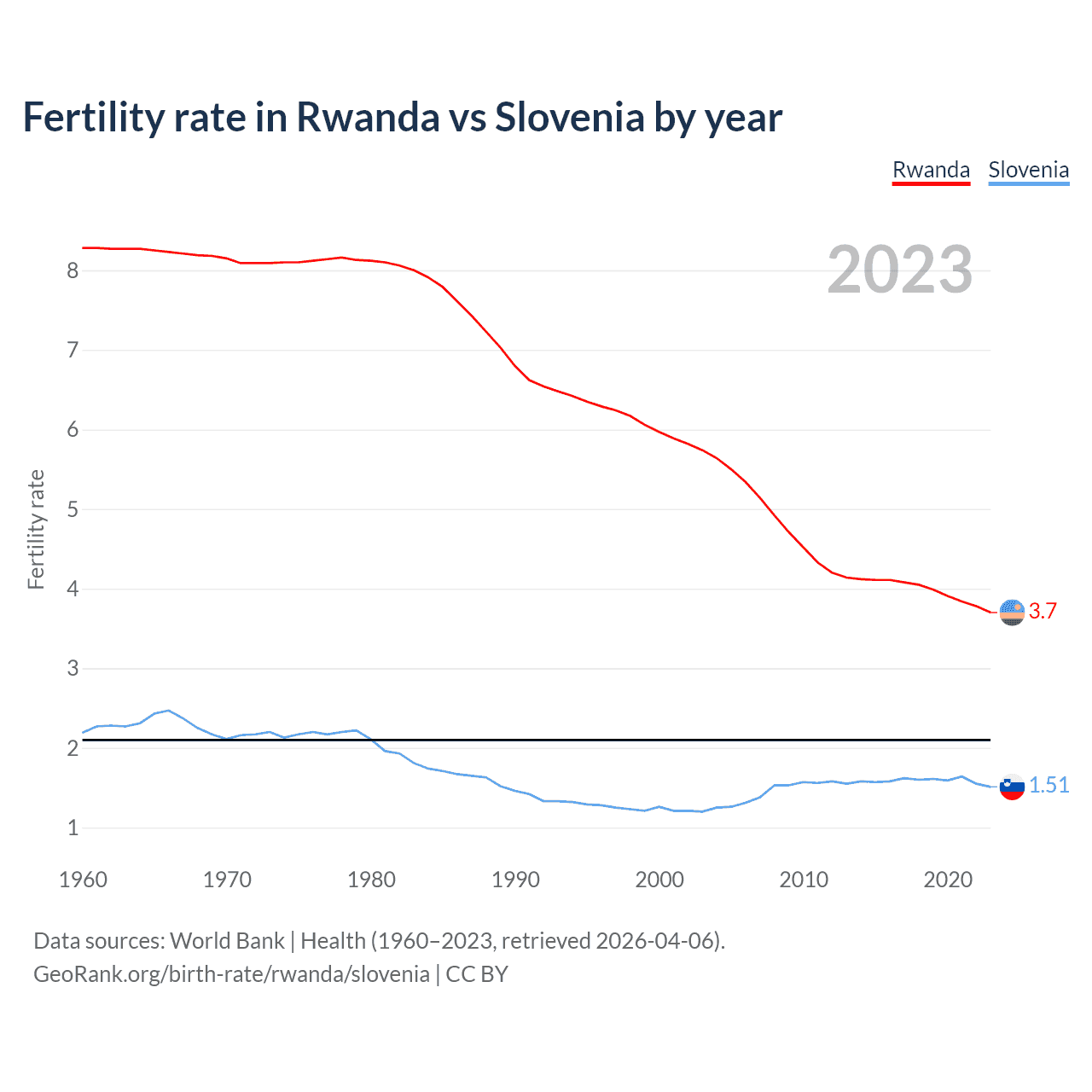 According to the latest available data on birth rates, the fertility rate in Rwanda was 3.7 children per woman in 2023, compared to 1.51 in Slovenia in 2023. The replacement level is considered to be 2.1 children per woman.