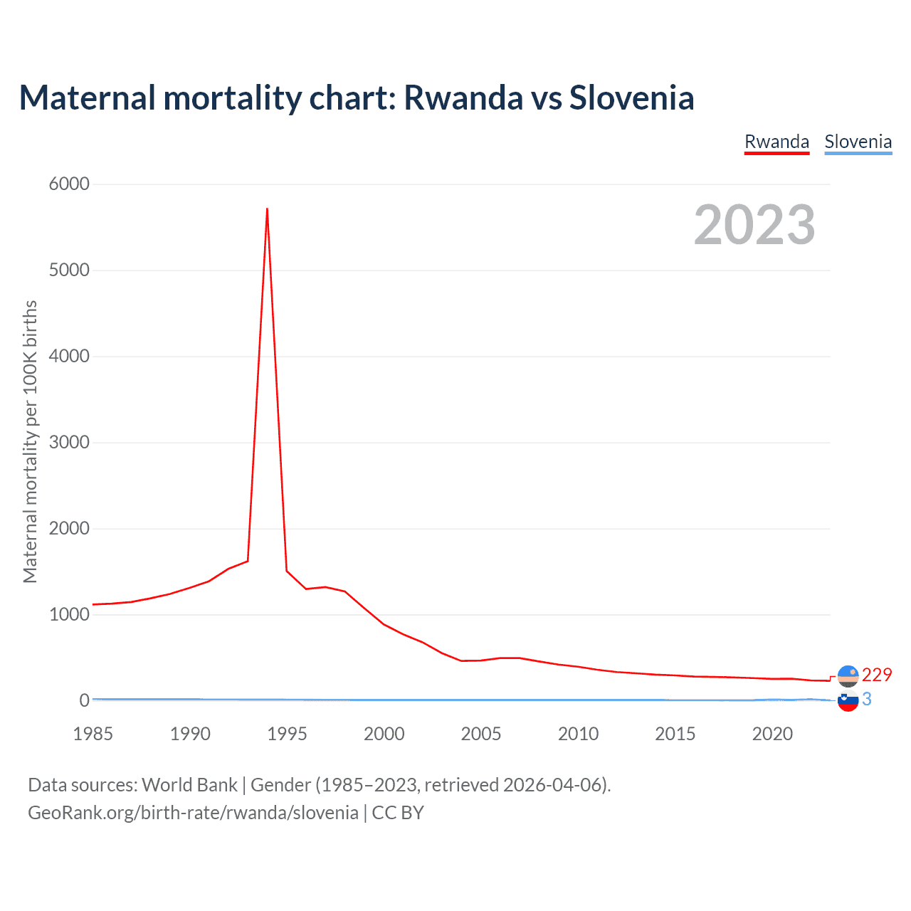 The maternal mortality rate, which is the probability of dying during childbirth or within 42 days of pregnancy termination, is 229 deaths per 100,000 live births in Rwanda, compared to 3 deaths in Slovenia.