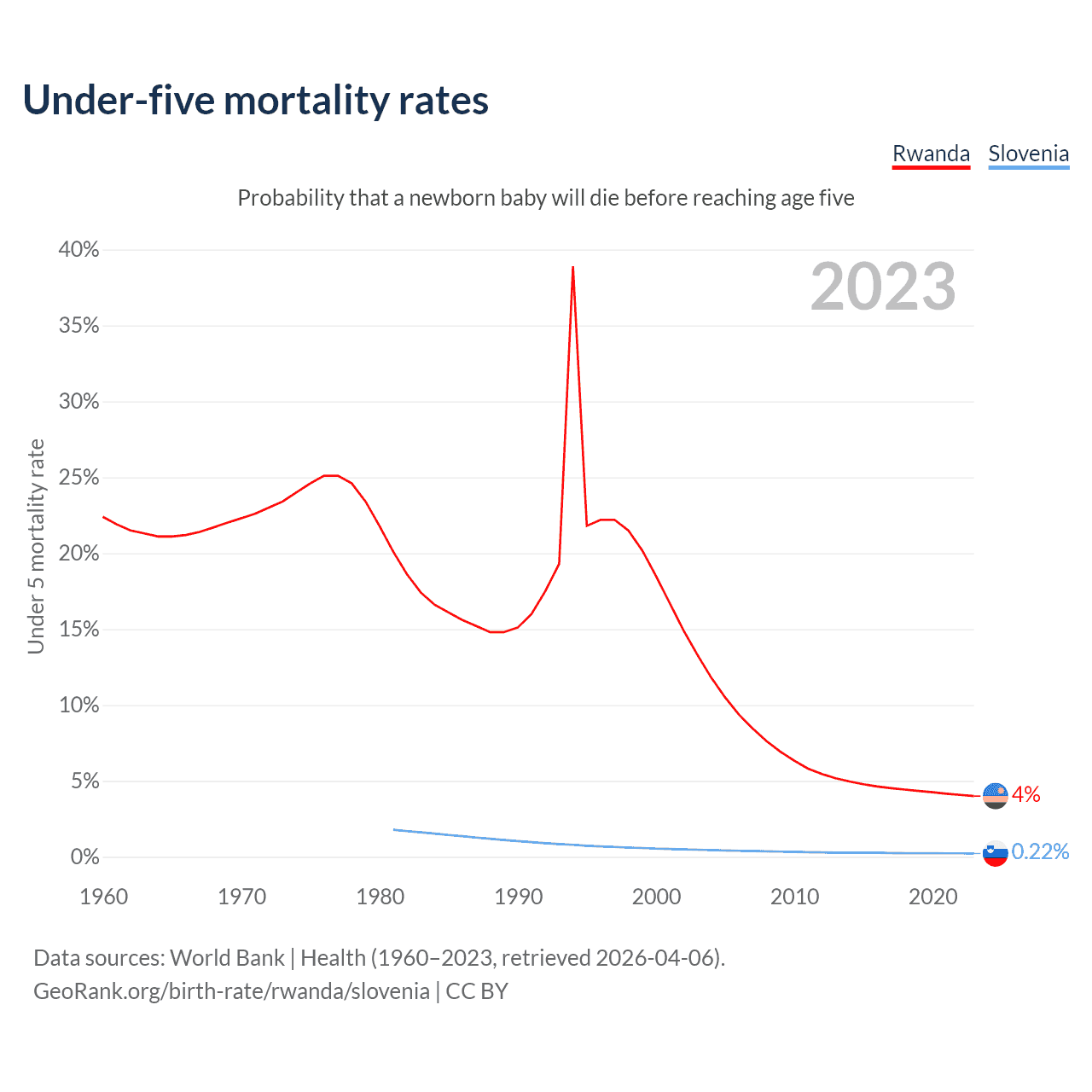 The chance that a newborn baby will die before reaching age five is 4% in Rwanda and 0.22% in Slovenia. Above is a chart with historical data on under-five mortality rates.