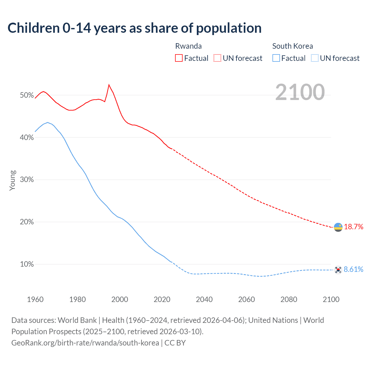 According to the latest available data on birth rates, the fertility rate in Rwanda was 3.7 children per woman in 2023, compared to 0.72 in South Korea in 2023. The replacement level is considered to be 2.1 children per woman.