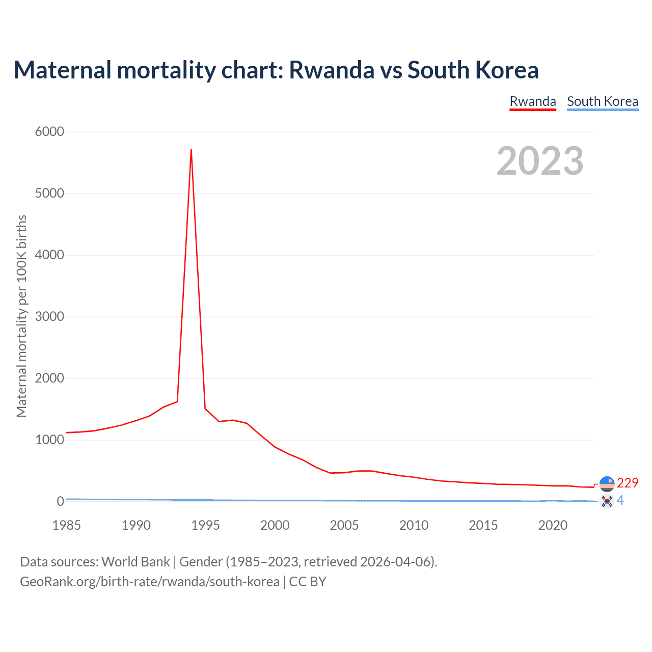 The maternal mortality rate, which is the probability of dying during childbirth or within 42 days of pregnancy termination, is 229 deaths per 100,000 live births in Rwanda, compared to 4 deaths in South Korea.