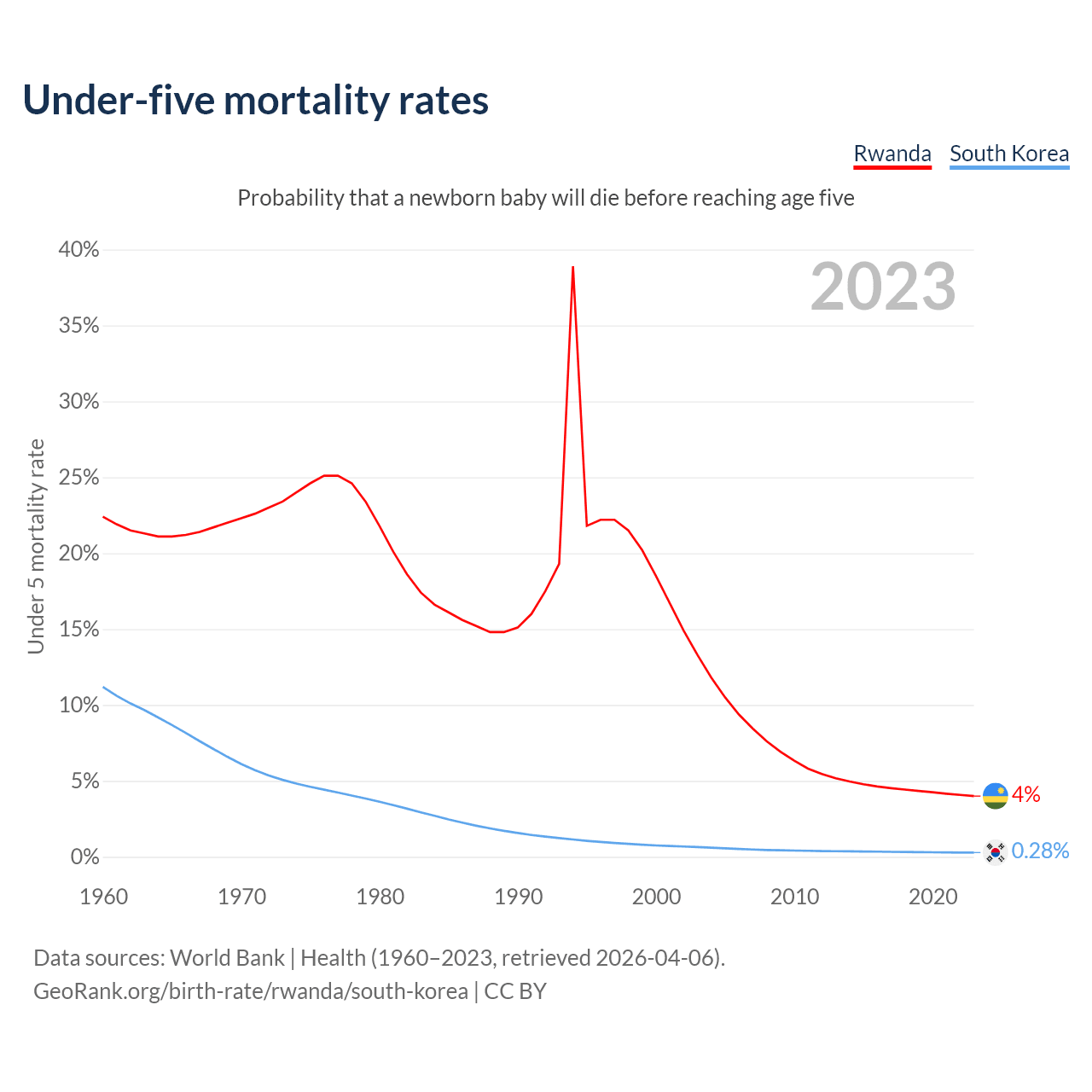 The chance that a newborn baby will die before reaching age five is 4% in Rwanda and 0.28% in South Korea. Above is a chart with historical data on under-five mortality rates.