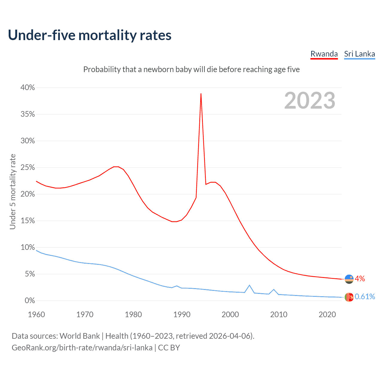 The chance that a newborn baby will die before reaching age five is 4% in Rwanda and 0.61% in Sri Lanka. Above is a chart with historical data on under-five mortality rates.