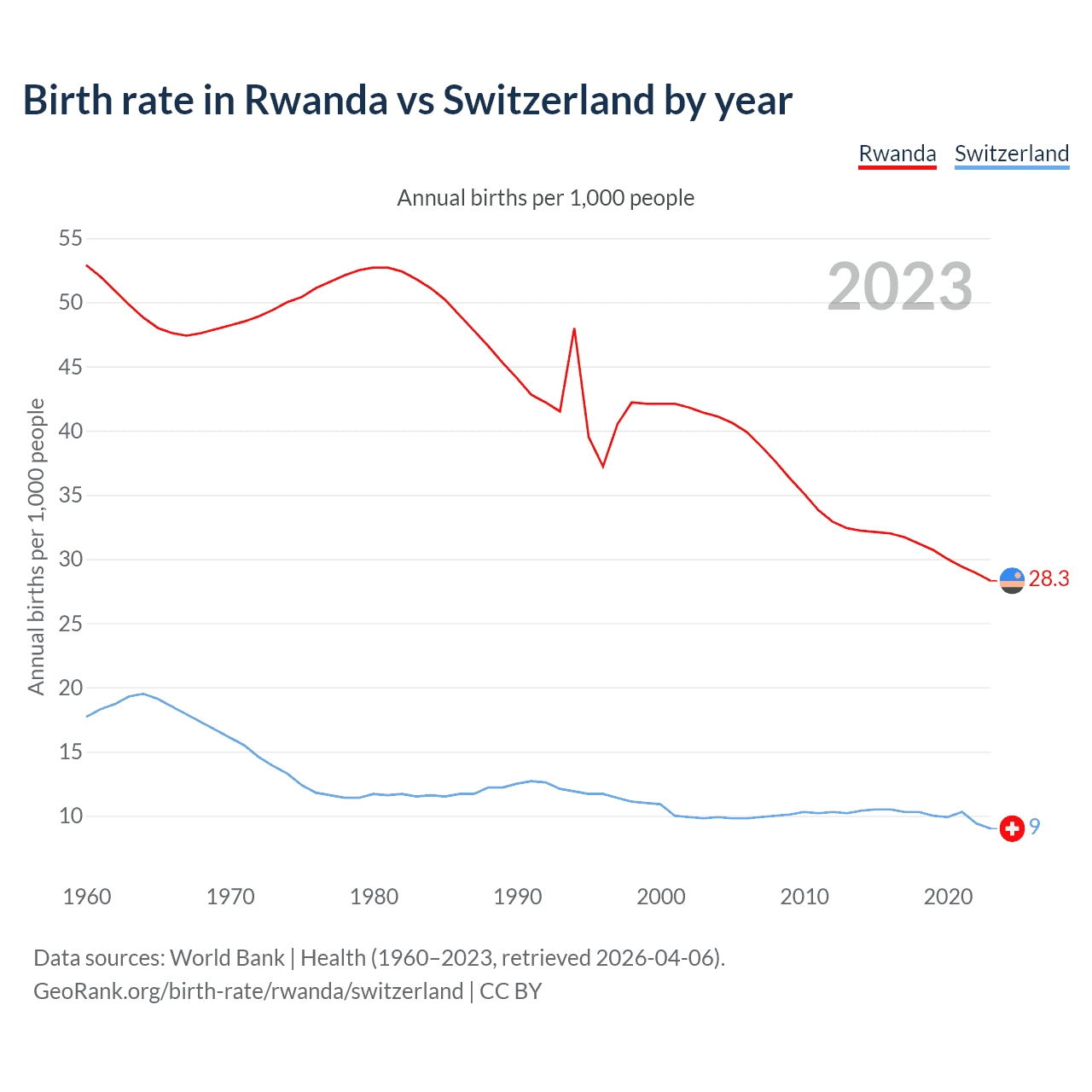 Rwanda has an annual birth rate of 28.3 births per 1,000 people, compared to 9 for Switzerland. The average number of children a woman is expected to have during her lifetime — the fertility rate, is 3.7 in Rwanda and 1.33 in Switzerland — 64% difference.
