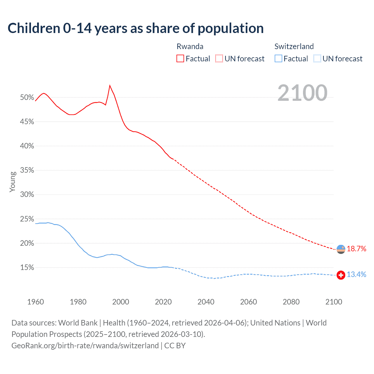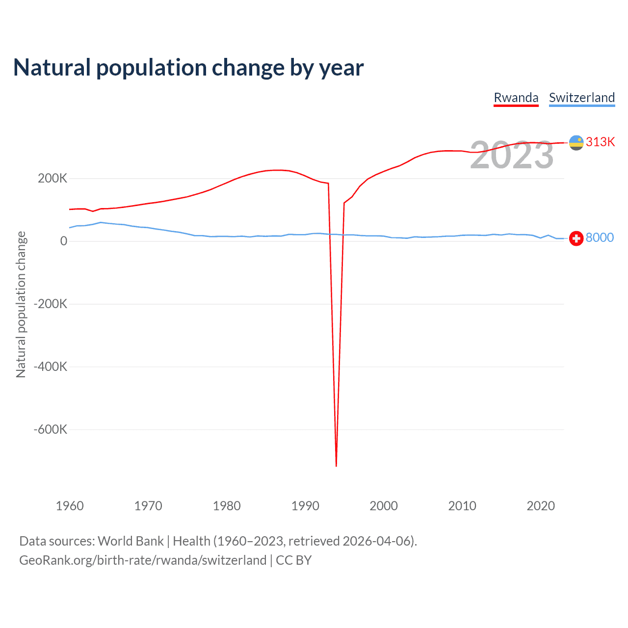 According to the latest available data on birth rates, the fertility rate in Rwanda was 3.7 children per woman in 2023, compared to 1.33 in Switzerland in 2023. The replacement level is considered to be 2.1 children per woman.