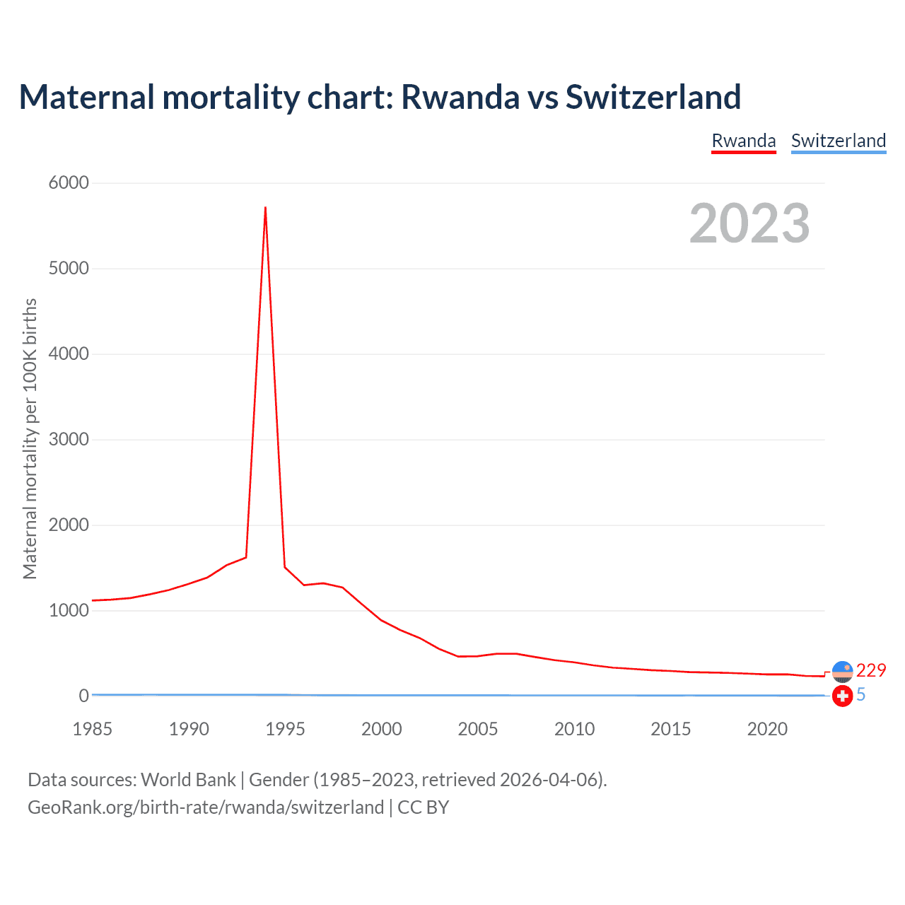 The maternal mortality rate, which is the probability of dying during childbirth or within 42 days of pregnancy termination, is 229 deaths per 100,000 live births in Rwanda, compared to 5 deaths in Switzerland.