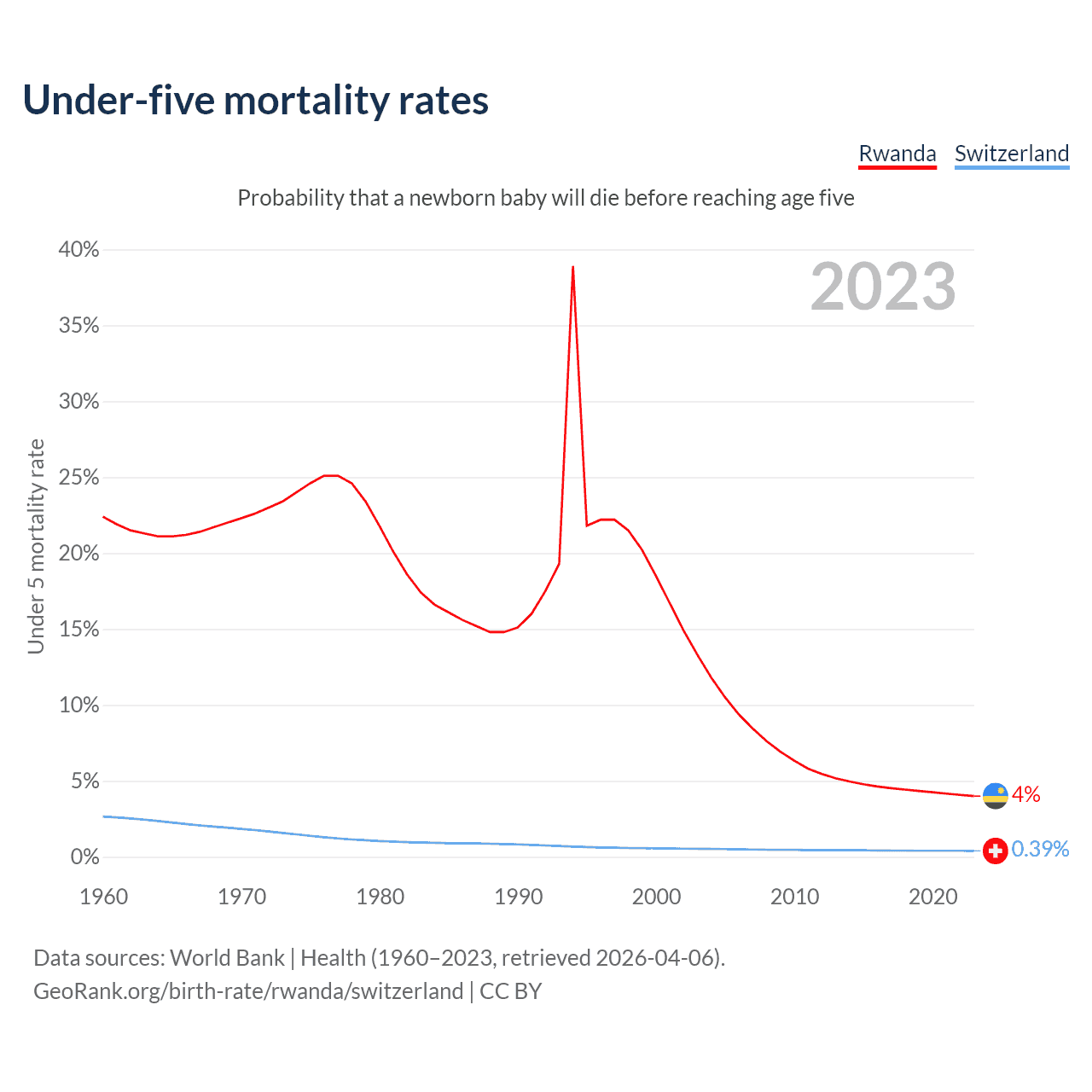 The chance that a newborn baby will die before reaching age five is 4% in Rwanda and 0.39% in Switzerland. Above is a chart with historical data on under-five mortality rates.