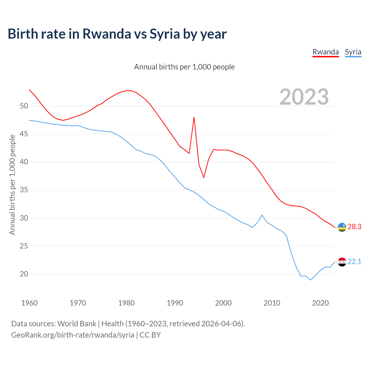 Rwanda has an annual birth rate of 28.3 births per 1,000 people, compared to 22.1 for Syria. The average number of children a woman is expected to have during her lifetime — the fertility rate, is 3.7 in Rwanda and 2.71 in Syria — 26.7% difference.