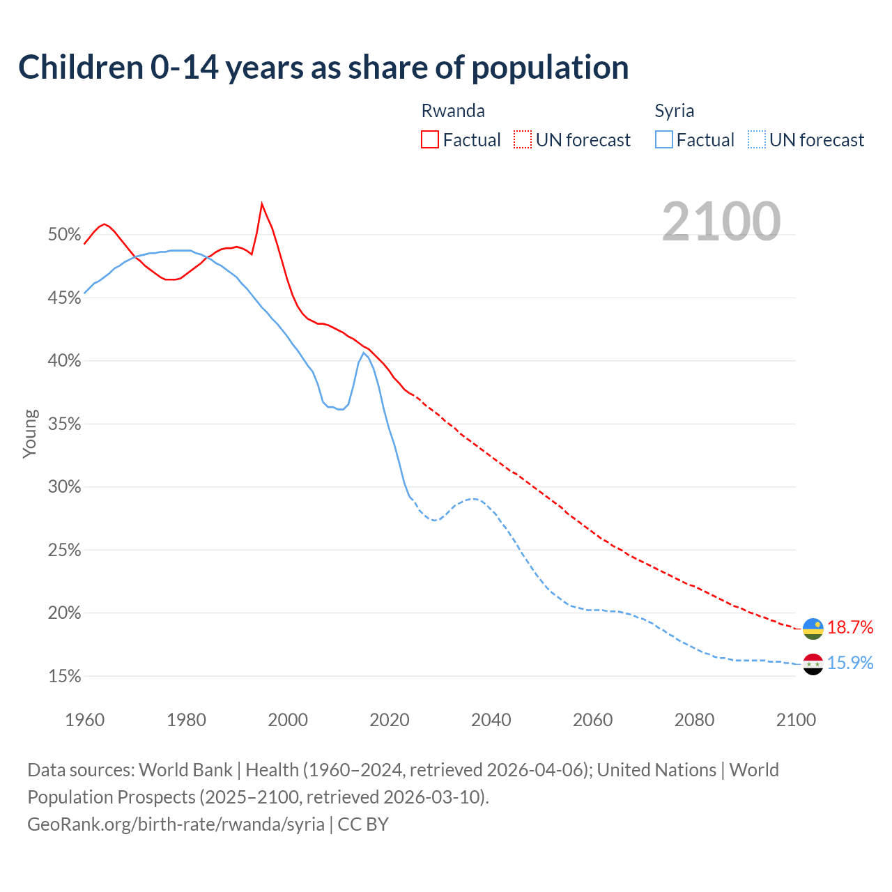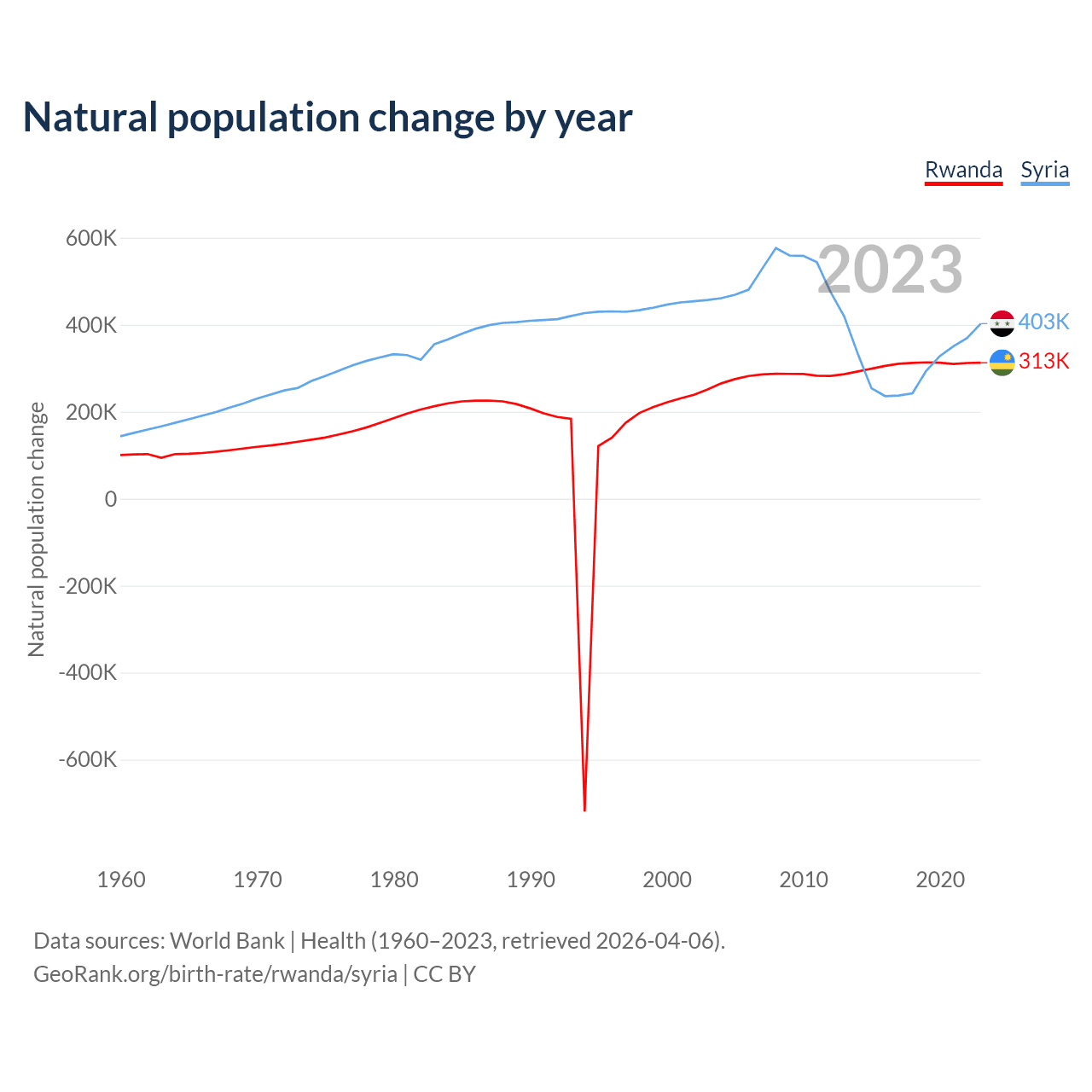 According to the latest available data on birth rates, the fertility rate in Rwanda was 3.7 children per woman in 2023, compared to 2.71 in Syria in 2023. The replacement level is considered to be 2.1 children per woman.