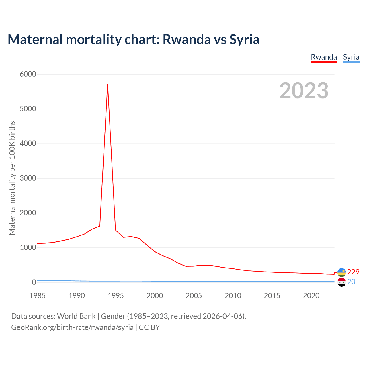 The maternal mortality rate, which is the probability of dying during childbirth or within 42 days of pregnancy termination, is 229 deaths per 100,000 live births in Rwanda, compared to 20 deaths in Syria.