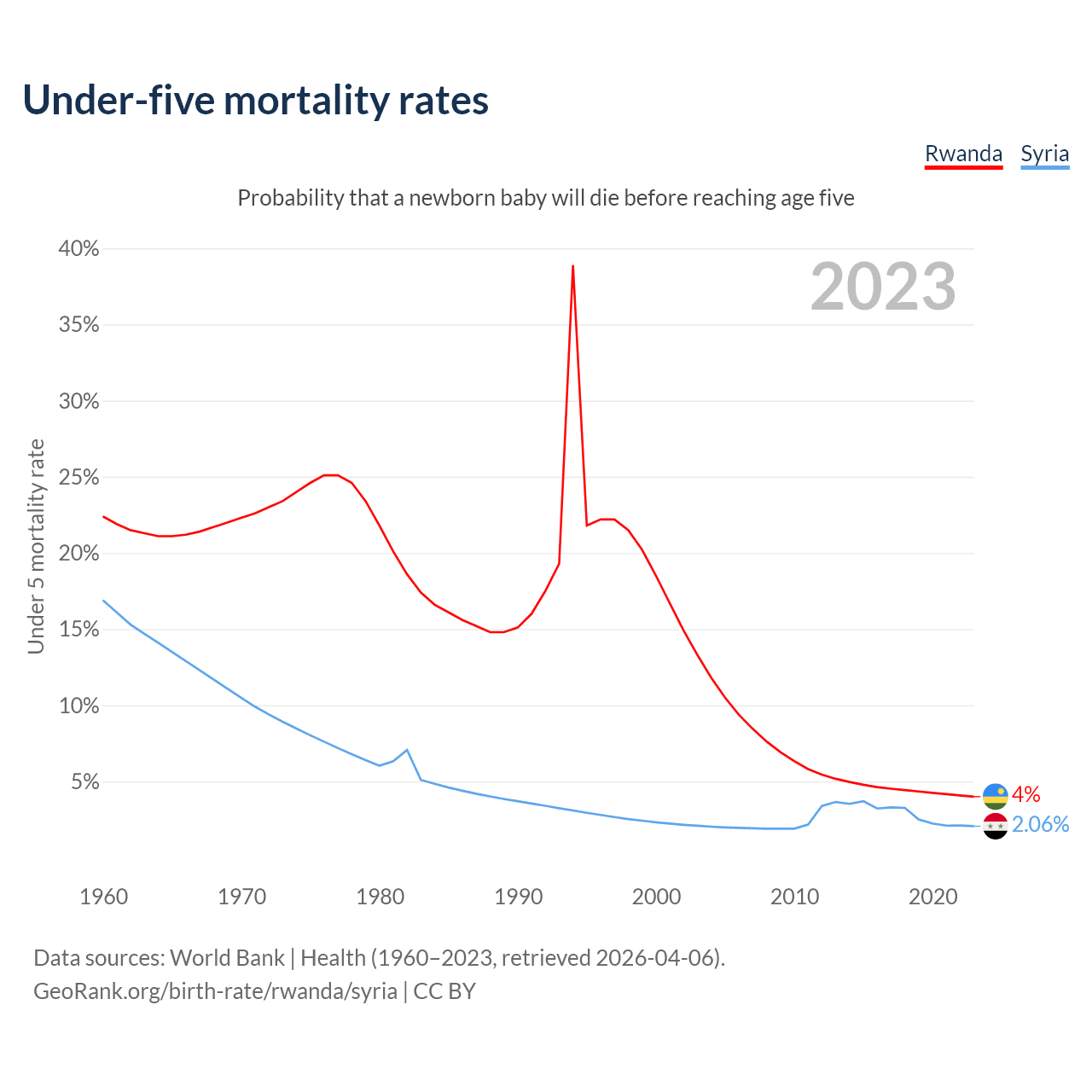 The chance that a newborn baby will die before reaching age five is 4% in Rwanda and 2.06% in Syria. Above is a chart with historical data on under-five mortality rates.