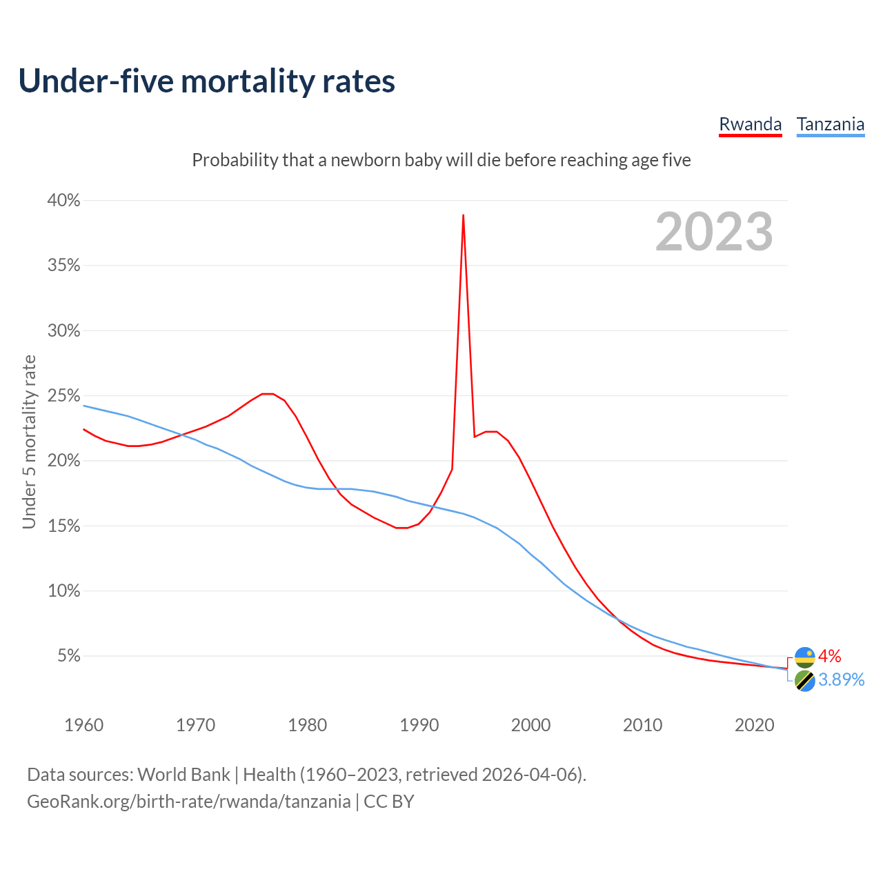 The chance that a newborn baby will die before reaching age five is 4% in Rwanda and 3.89% in Tanzania. Above is a chart with historical data on under-five mortality rates.