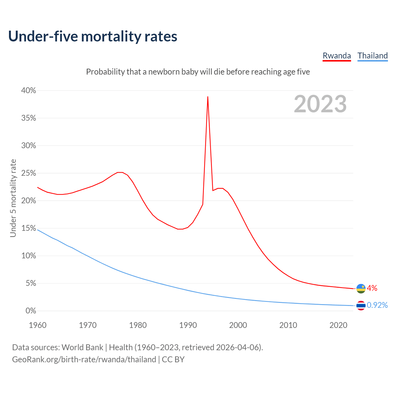 The chance that a newborn baby will die before reaching age five is 4% in Rwanda and 0.92% in Thailand. Above is a chart with historical data on under-five mortality rates.