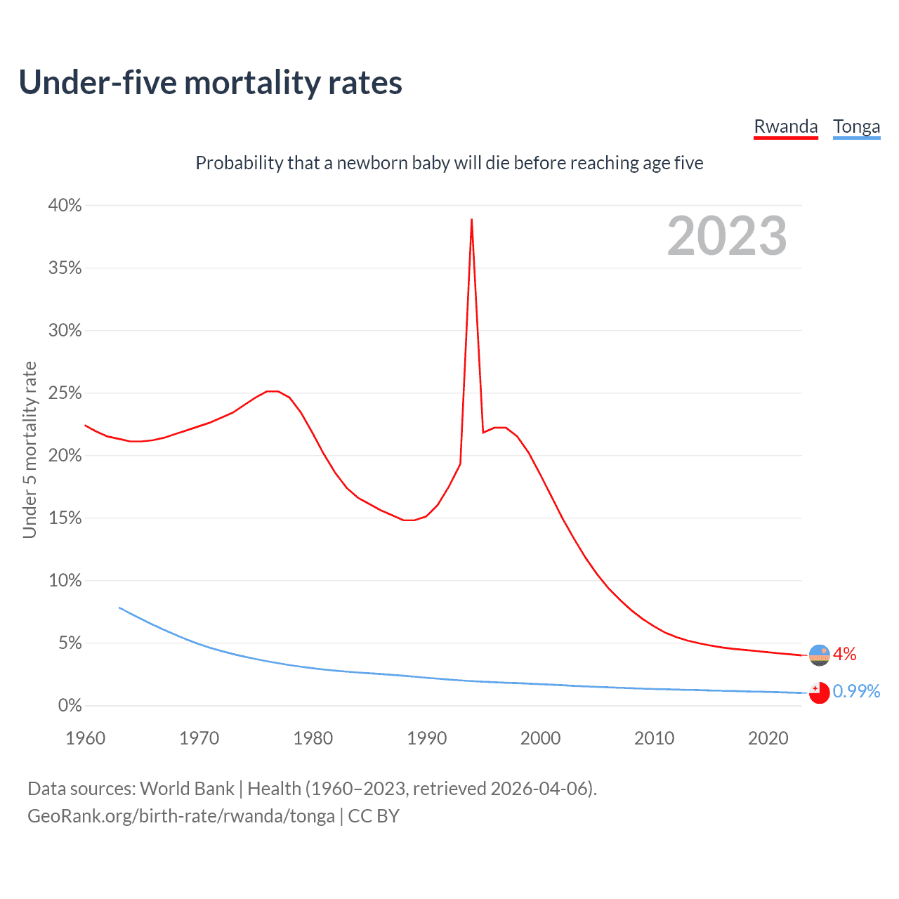 The chance that a newborn baby will die before reaching age five is 4% in Rwanda and 0.99% in Tonga. Above is a chart with historical data on under-five mortality rates.