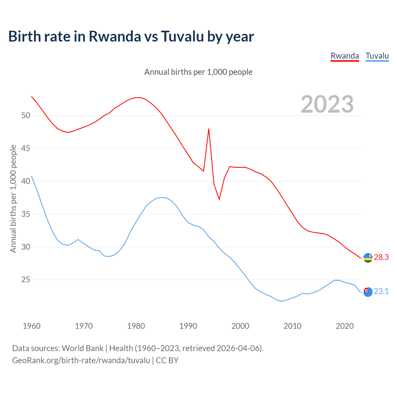 Rwanda has an annual birth rate of 28.3 births per 1,000 people, compared to 23.1 for Tuvalu. The average number of children a woman is expected to have during her lifetime — the fertility rate, is 3.7 in Rwanda and 3.21 in Tuvalu — 13.3% difference.