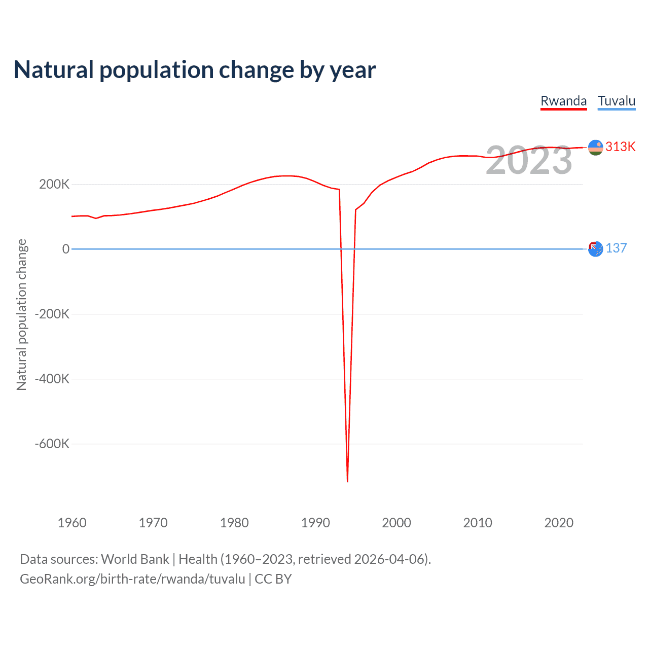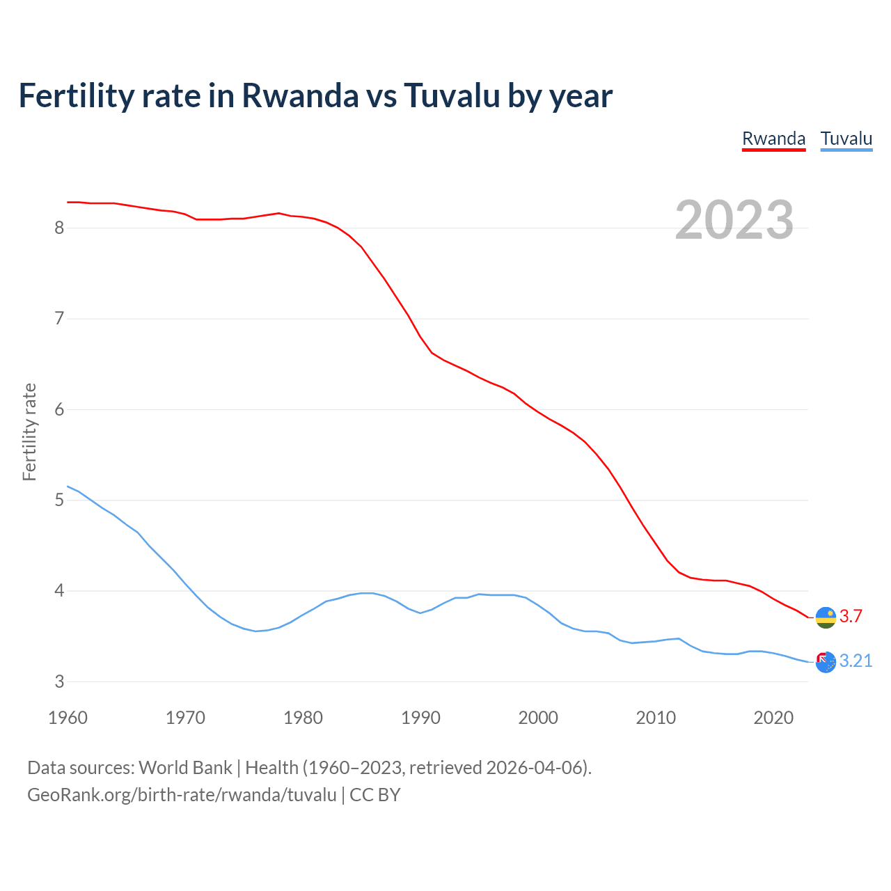 According to the latest available data on birth rates, the fertility rate in Rwanda was 3.7 children per woman in 2023, compared to 3.21 in Tuvalu in 2023. The replacement level is considered to be 2.1 children per woman.