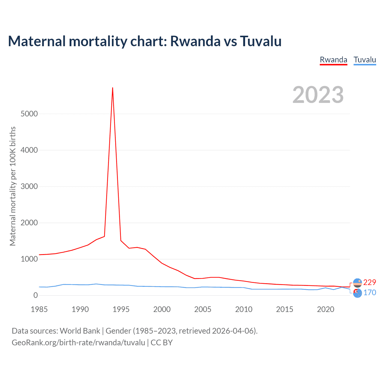 The maternal mortality rate, which is the probability of dying during childbirth or within 42 days of pregnancy termination, is 229 deaths per 100,000 live births in Rwanda, compared to 170 deaths in Tuvalu.