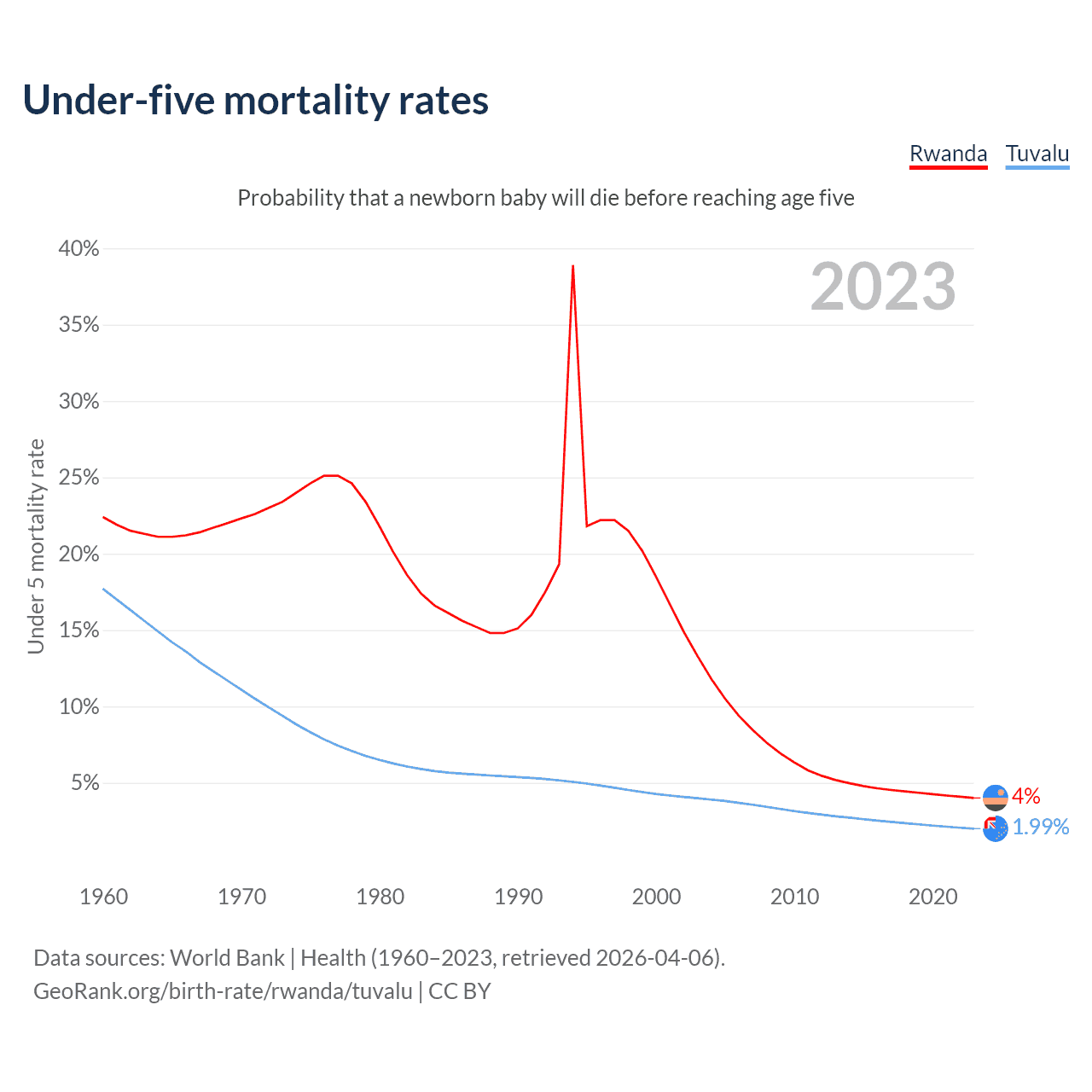 The chance that a newborn baby will die before reaching age five is 4% in Rwanda and 1.99% in Tuvalu. Above is a chart with historical data on under-five mortality rates.