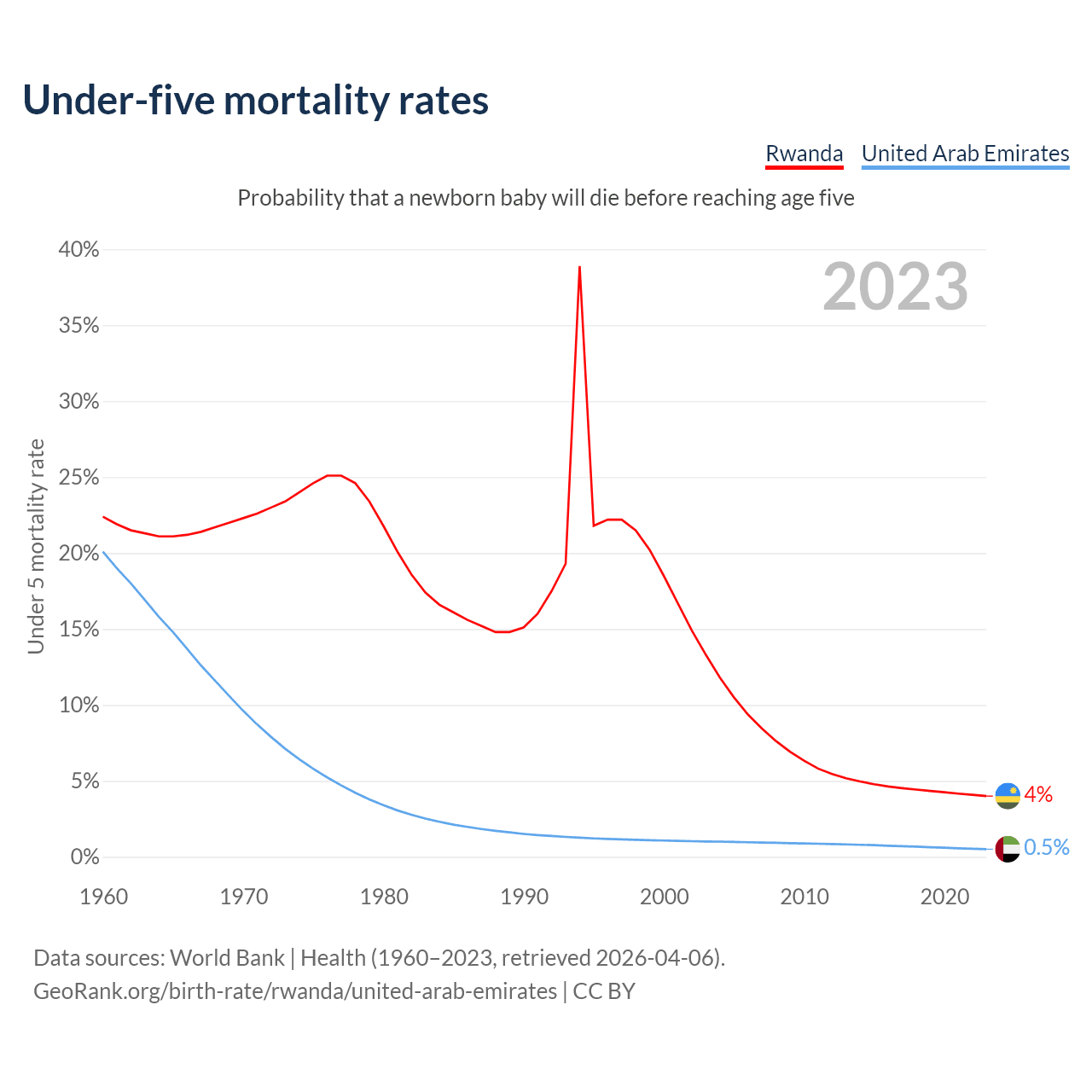 The chance that a newborn baby will die before reaching age five is 4% in Rwanda and 0.5% in the United Arab Emirates. Above is a chart with historical data on under-five mortality rates.