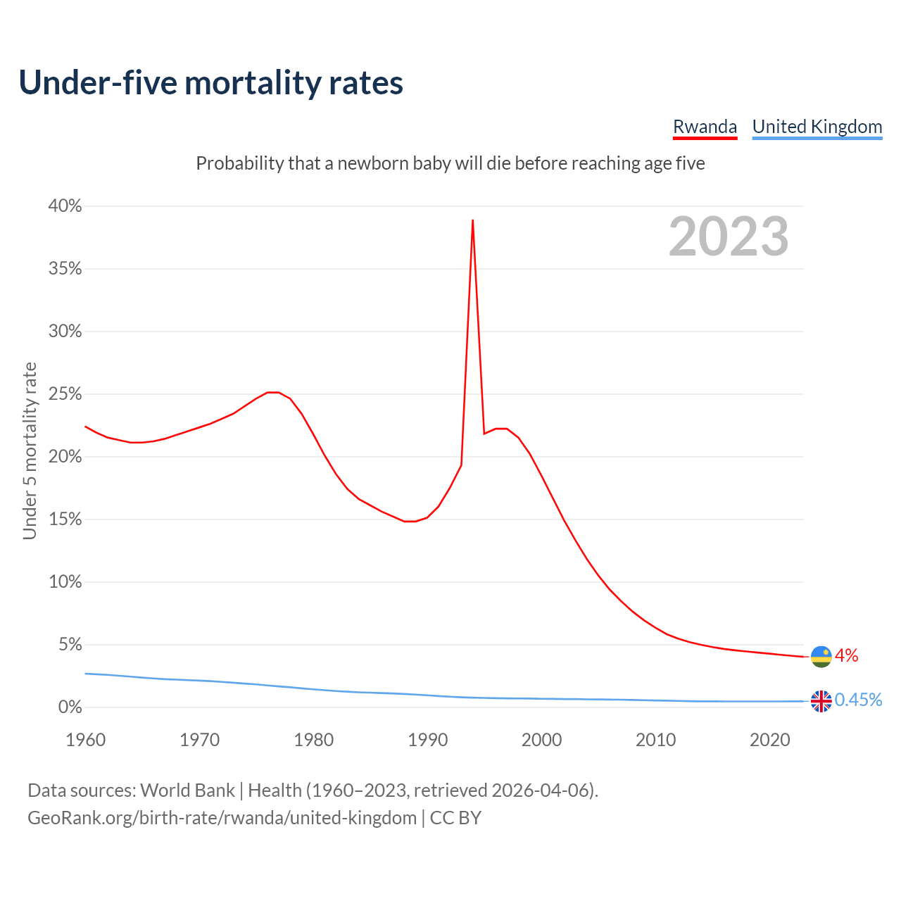 The chance that a newborn baby will die before reaching age five is 4% in Rwanda and 0.45% in the United Kingdom. Above is a chart with historical data on under-five mortality rates.