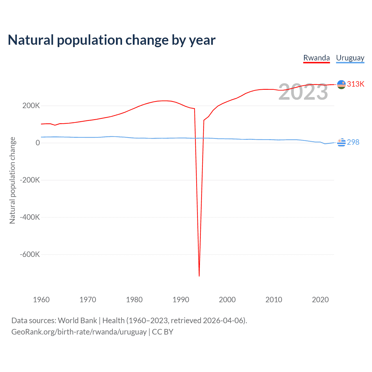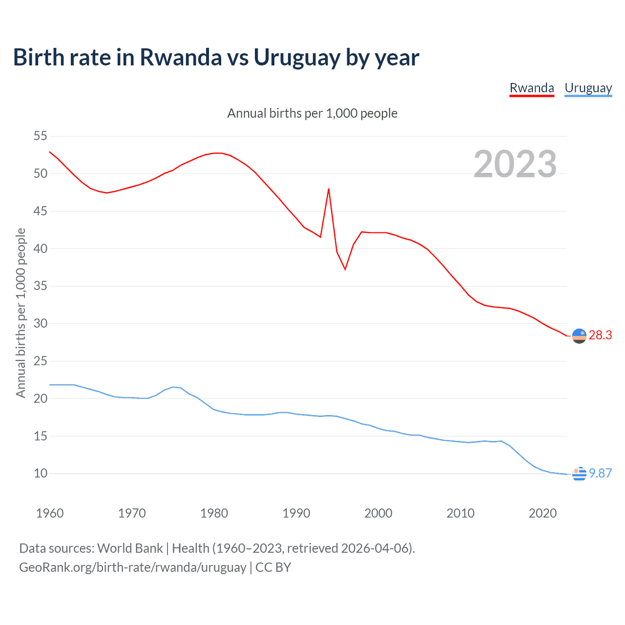 Rwanda has an annual birth rate of 28.3 births per 1,000 people, compared to 9.87 for Uruguay. The average number of children a woman is expected to have during her lifetime — the fertility rate, is 3.7 in Rwanda and 1.41 in Uruguay — 61.9% difference.