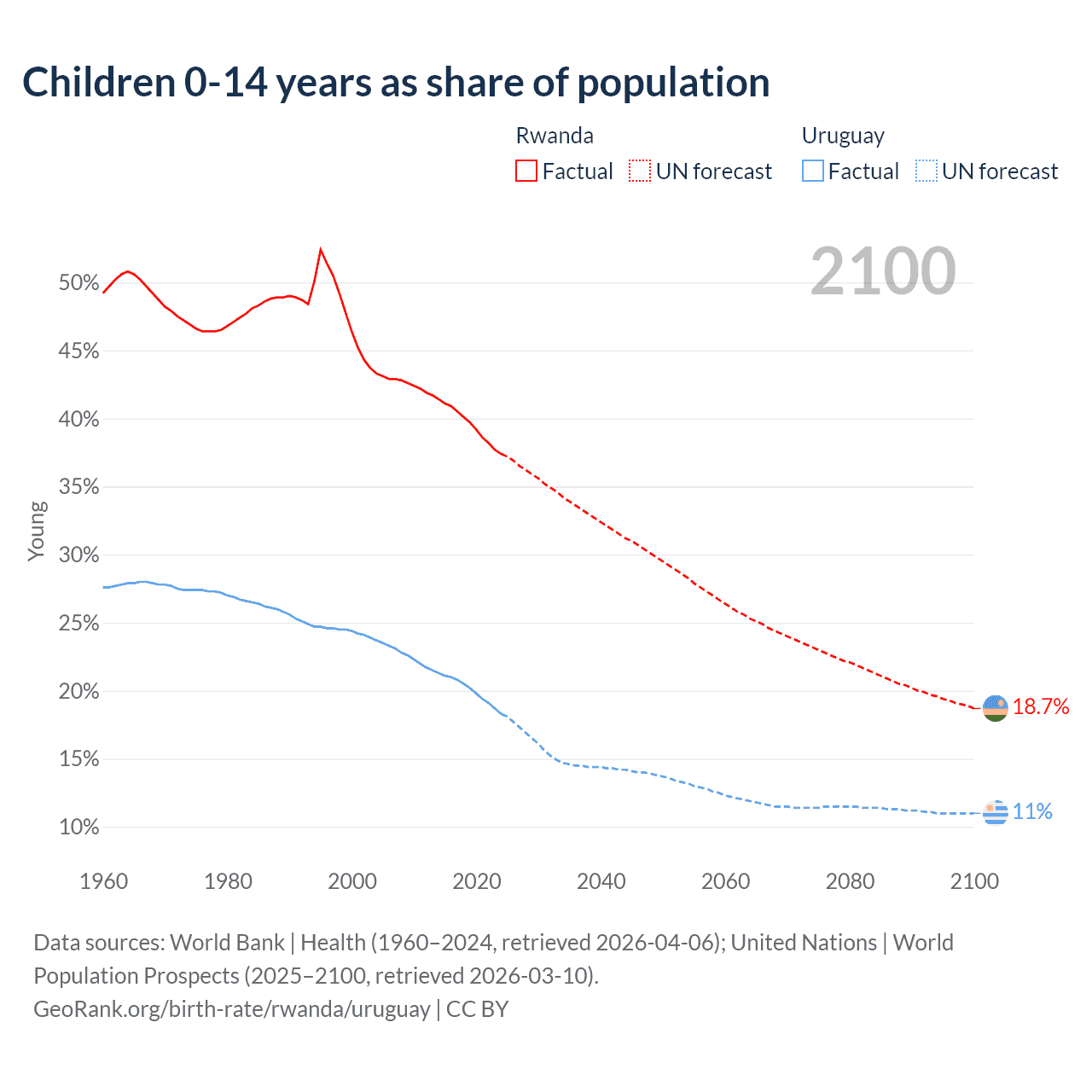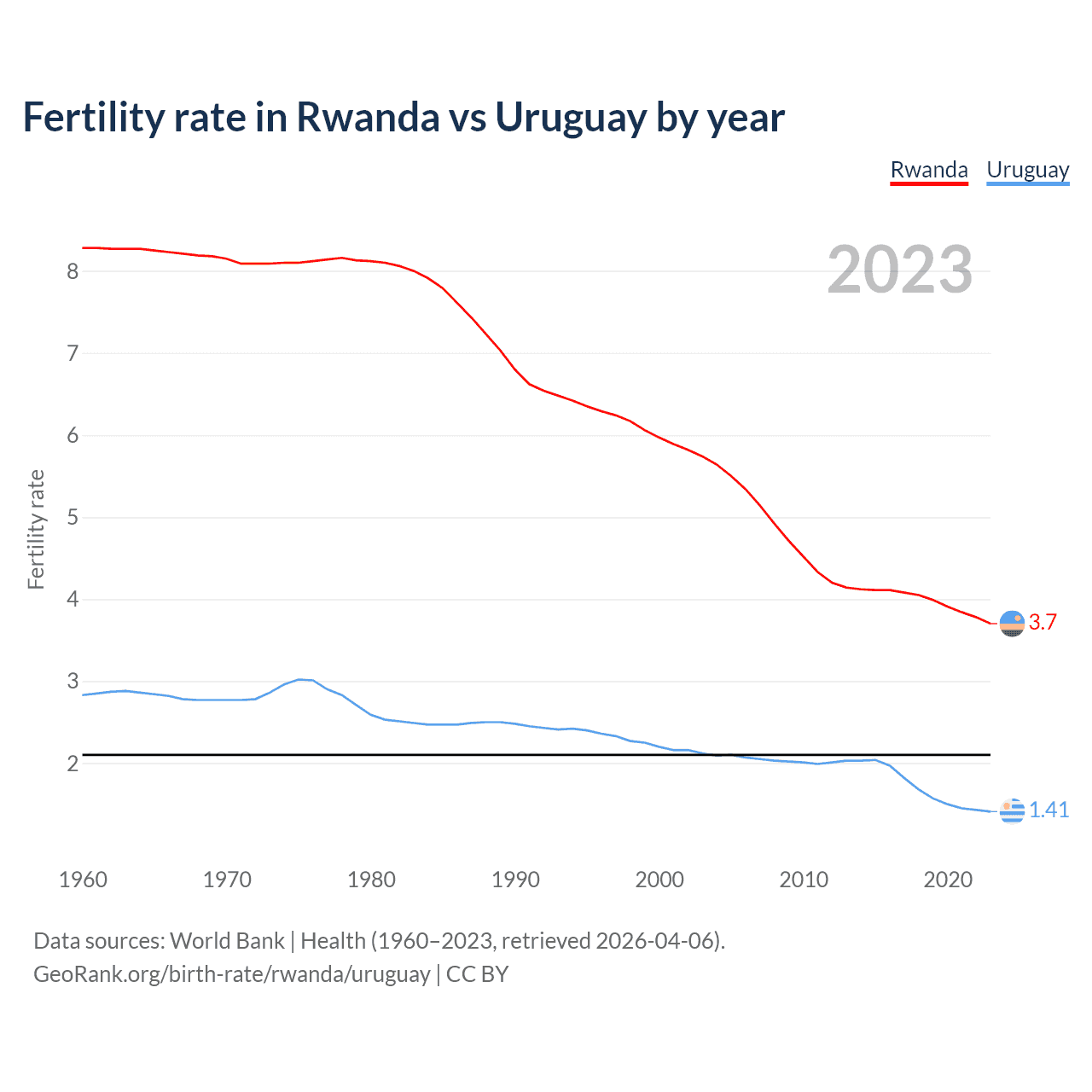 According to the latest available data on birth rates, the fertility rate in Rwanda was 3.7 children per woman in 2023, compared to 1.41 in Uruguay in 2023. The replacement level is considered to be 2.1 children per woman.