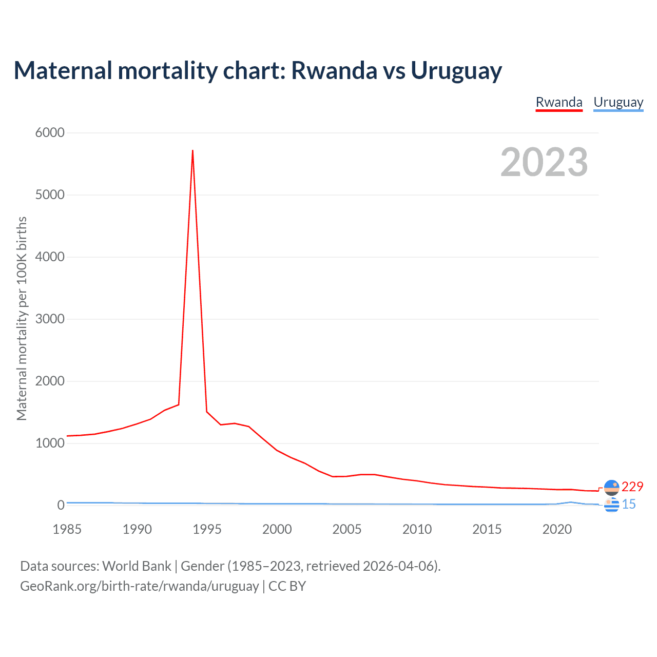 The maternal mortality rate, which is the probability of dying during childbirth or within 42 days of pregnancy termination, is 229 deaths per 100,000 live births in Rwanda, compared to 15 deaths in Uruguay.