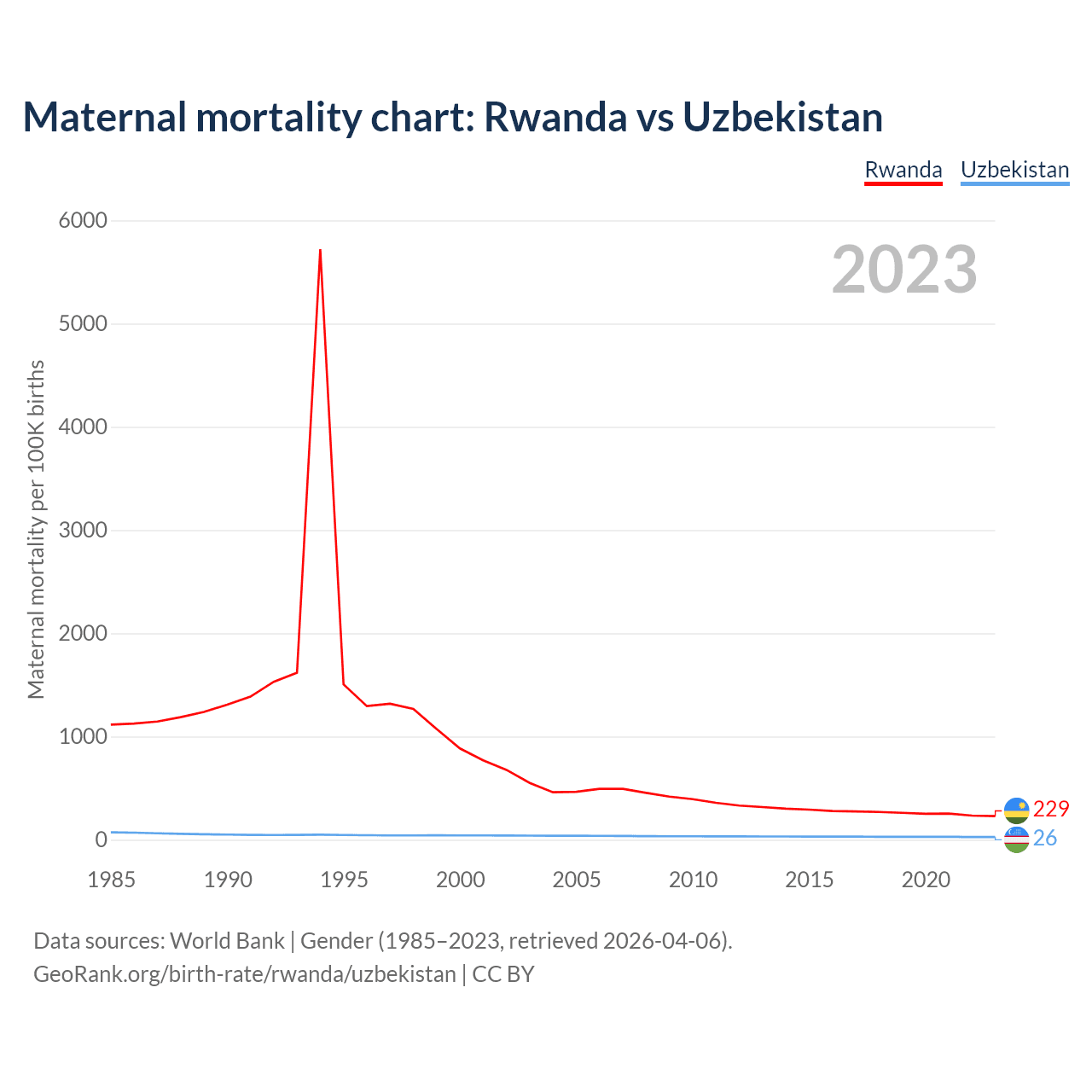 The maternal mortality rate, which is the probability of dying during childbirth or within 42 days of pregnancy termination, is 229 deaths per 100,000 live births in Rwanda, compared to 26 deaths in Uzbekistan.